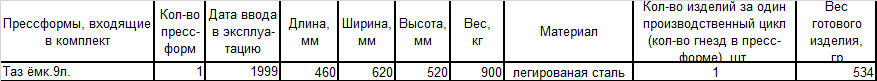 | Прессформы, входящие в комплект | Кол-во пресс- форм | Дата ввода в эксплуа-тацию | Длина, мм | Ширина, мм | Высота, мм | Вес, кг | Материал | Кол-во изделий за один производственный цикл (кол-во гнезд в пресс-форме), шт. | Вес готового изделия, гр |