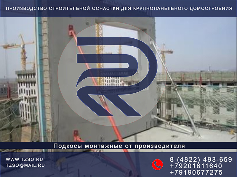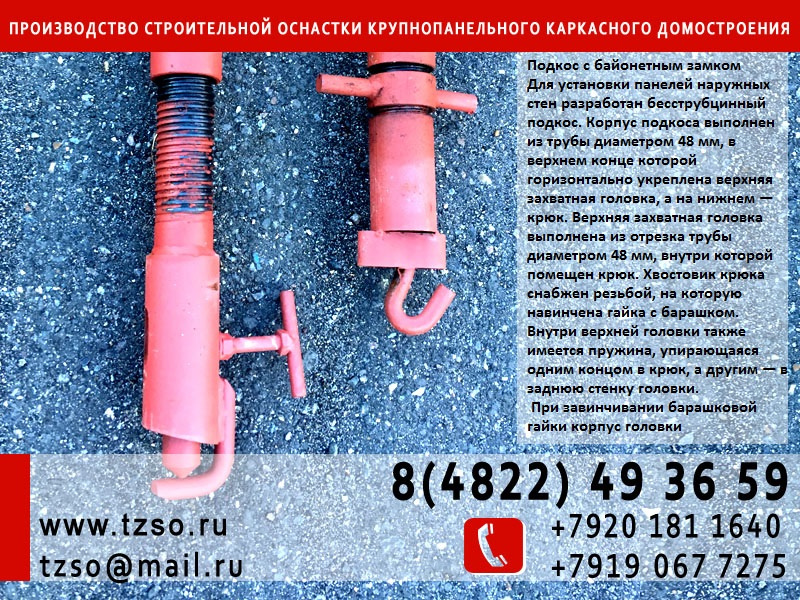 Монтажный подкос или крюк-крюк– это жесткая конструкция без собственных свойств устойчивости. Действует на линейное сжатие и используется для фиксирования элементов в установленной позиции. Это универсальное и распространенное приспособления для крепления невысоких колонн, элементов перегородки, панелей и прочих сборочных компонентов до финального проектного монтажа.Также применяется в каркасно-монолитных постройках.Несущие элементы производятся в соответствии с нормативами ГОСТ для соблюдения коэффициента стойкости.