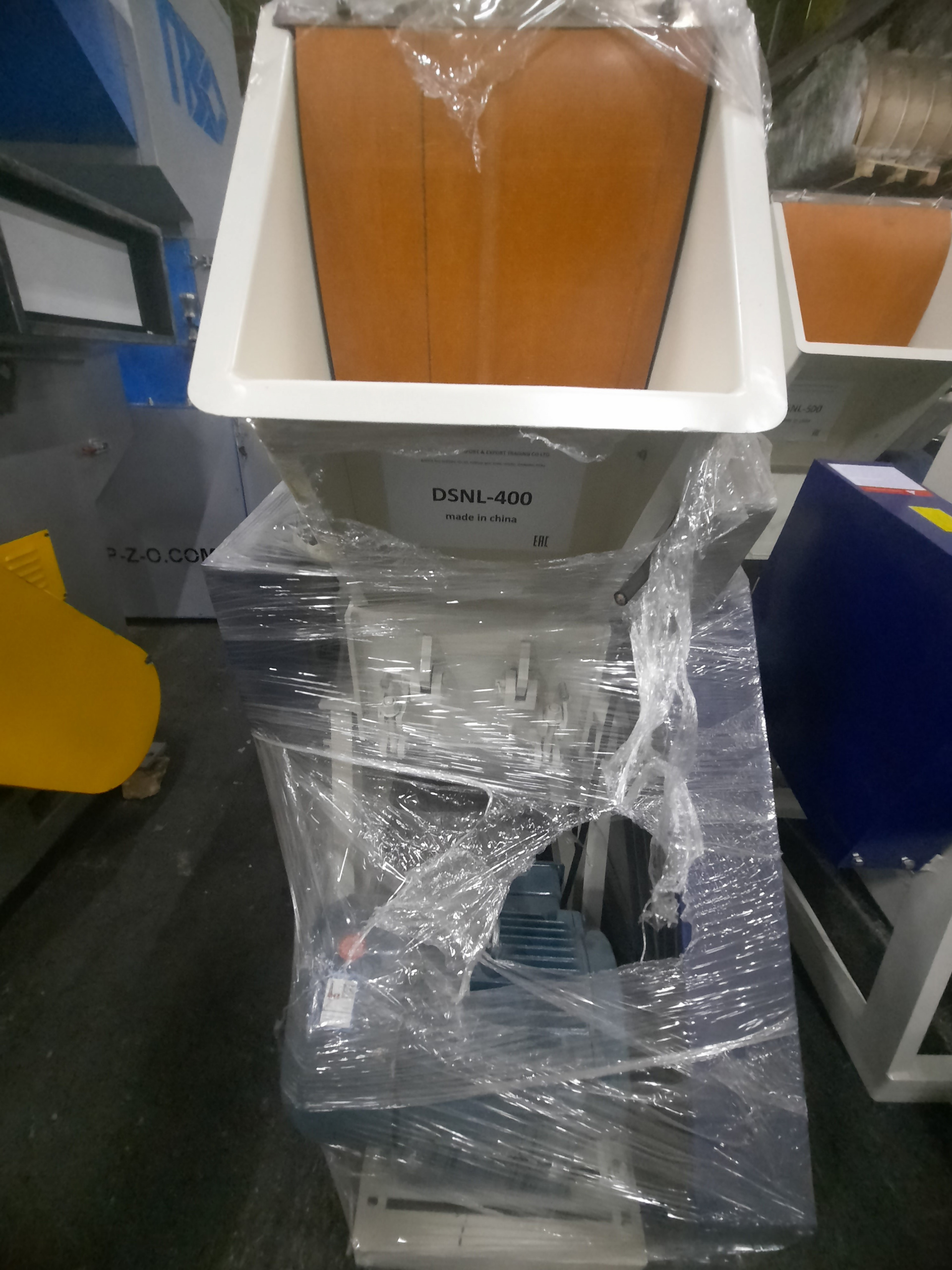 Дробилка DSNL-400 предназначены для дробления плёночных отходов пластмасс, стрейч пленки, тканного полипропиленового полотна (биг-бэги с лямками не рекомендовано), тары в виде ящиков, канистры, ПЭТ-бутылки и прочих пластмасс толщиной стенок до 5 мм Технические характеристики Производительность: до 200кг/ч (в зависимости от материала) Мощность двигателя: 11 кВт (380В); Расположение ножей: Ласточкин хвос Количество роторных ножей: 6 Количество стационарных ножей: 2 Общие размеры (ДхШхВ) 1142x853x1581 мм Вес 440 кг В комплекте паспорт, декларация соответствия ТР Евросоюза В продаже запасные комплекты ножей для дробилки, есть возможность пробного запуска на вашем сырье. А также в наличии всевозможное оборудование, комплектующие и периферия для линий переработки пластика.
