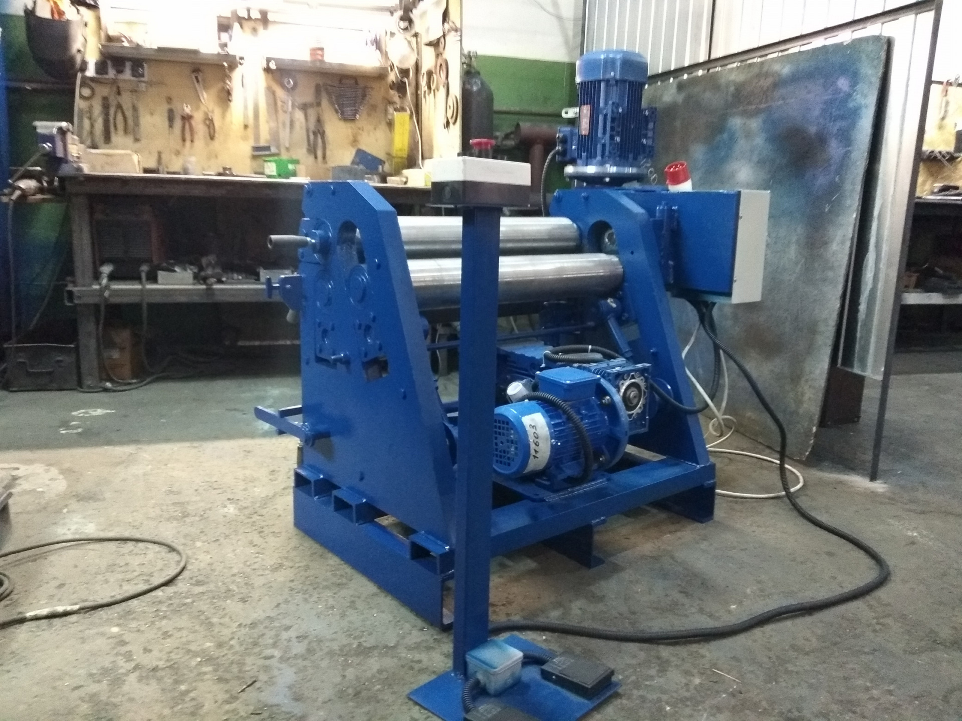 - Дополнительные опции: упор для прокатывания конусов, закалка валов, моторизированный верхний вал, частотный преобразователь на 220В (Позволяет управлять скоростью вращения валов)