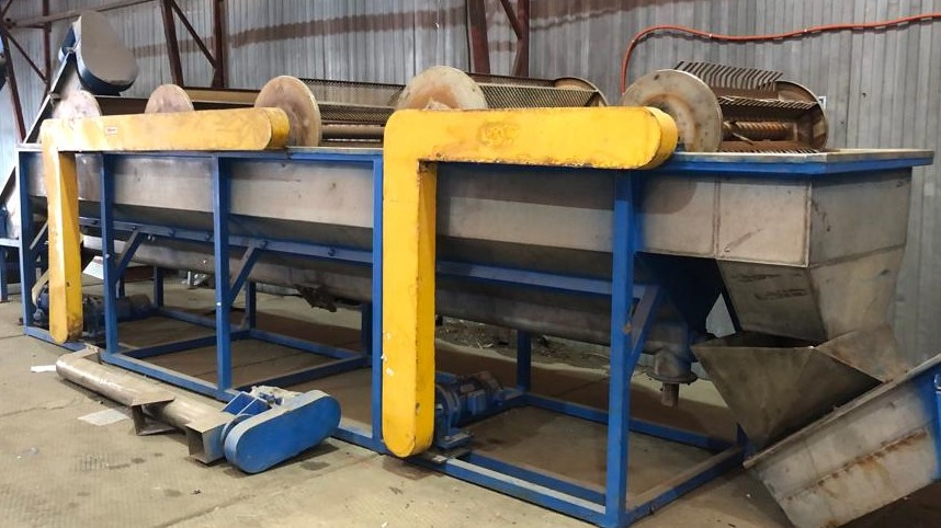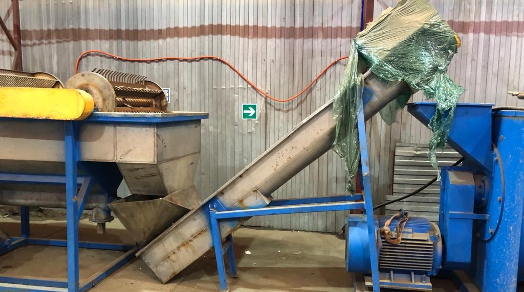 Принцип действия: материал подается в установку мойки (ванна), путем вращения шнека происходит удаление загрязнений, которые оседают на дне ванны. После мойки сырье попадает в центрифугу для отжима, где происходит удаление остатков загрязнений. Далее через установку циклон происходит просушка материла, на выходе получается материал влажностью 5-7%, что позволяет сразу же передавать сырье на следующую стадию переработки.