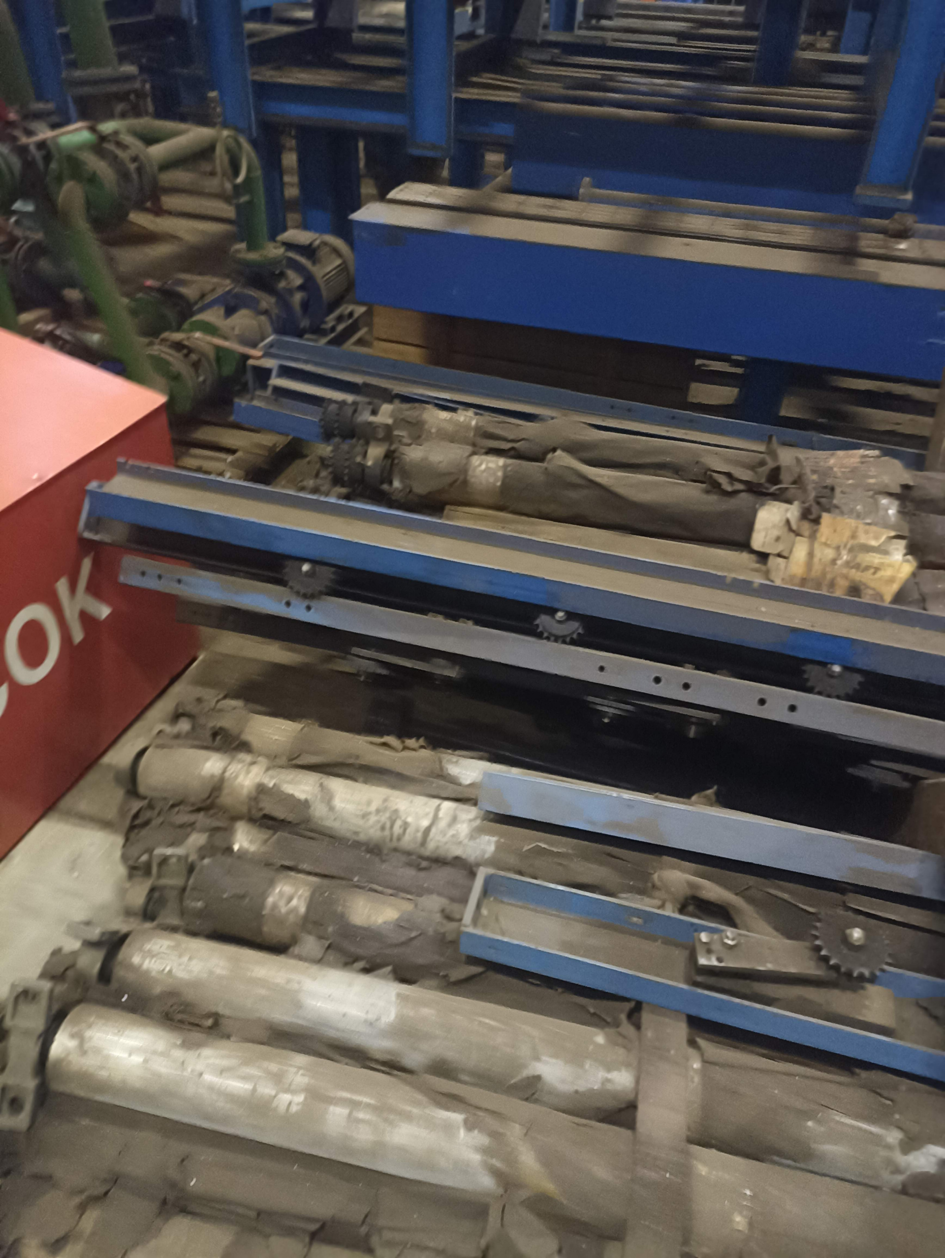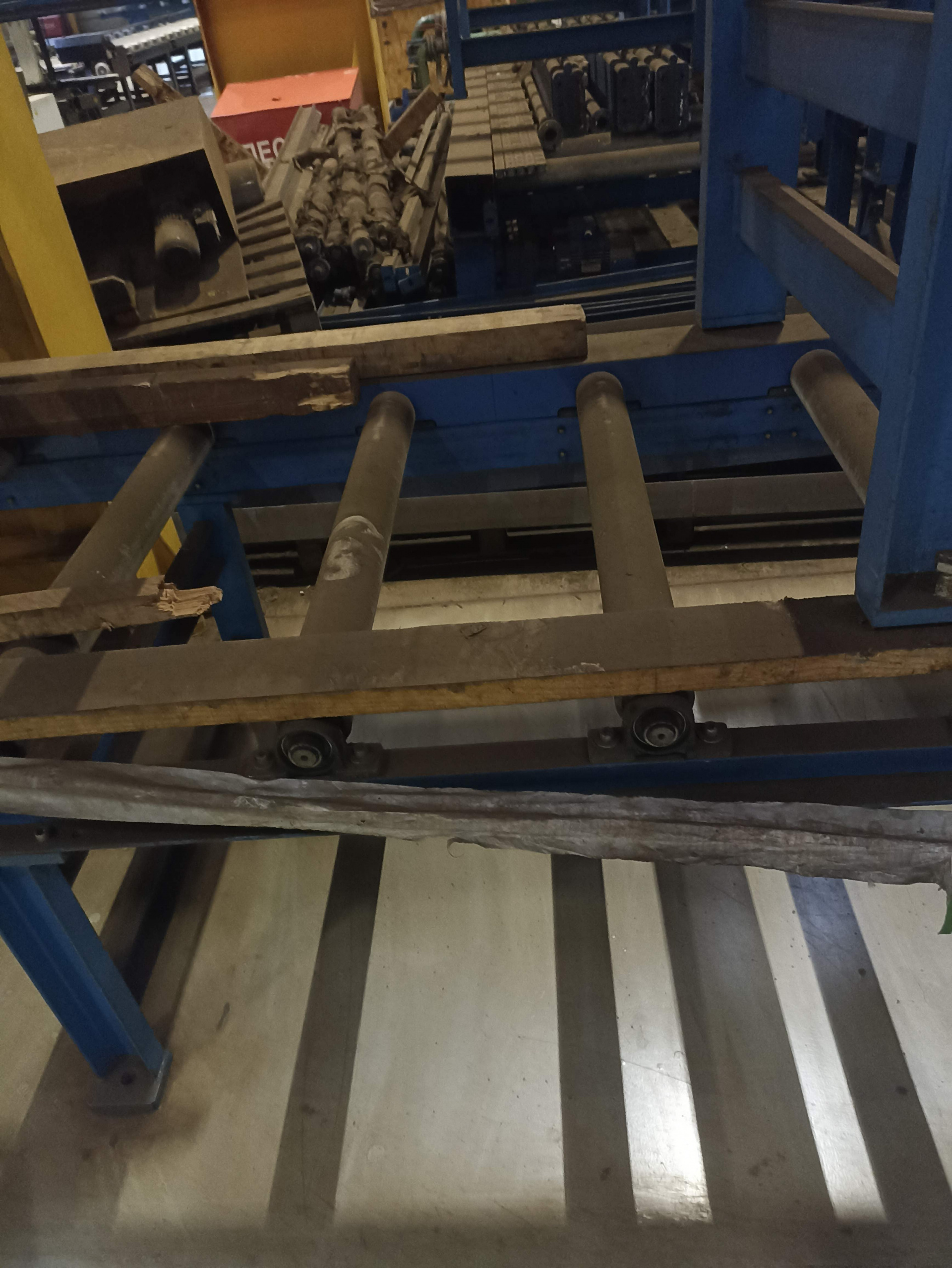 (Рольганг),с автоматической (цепной привод от мотор-редуктора в каждой секции) подачей заготовки, размер ролика 930х85 мм, ширина основания 1090 мм, высота стола от 870 мм, длина секции 4050 мм. Расстояние между центрами роликов 820 мм. Опорные узлы роликов с системой смазки под давлением. 8 шт.32,400 м.п.