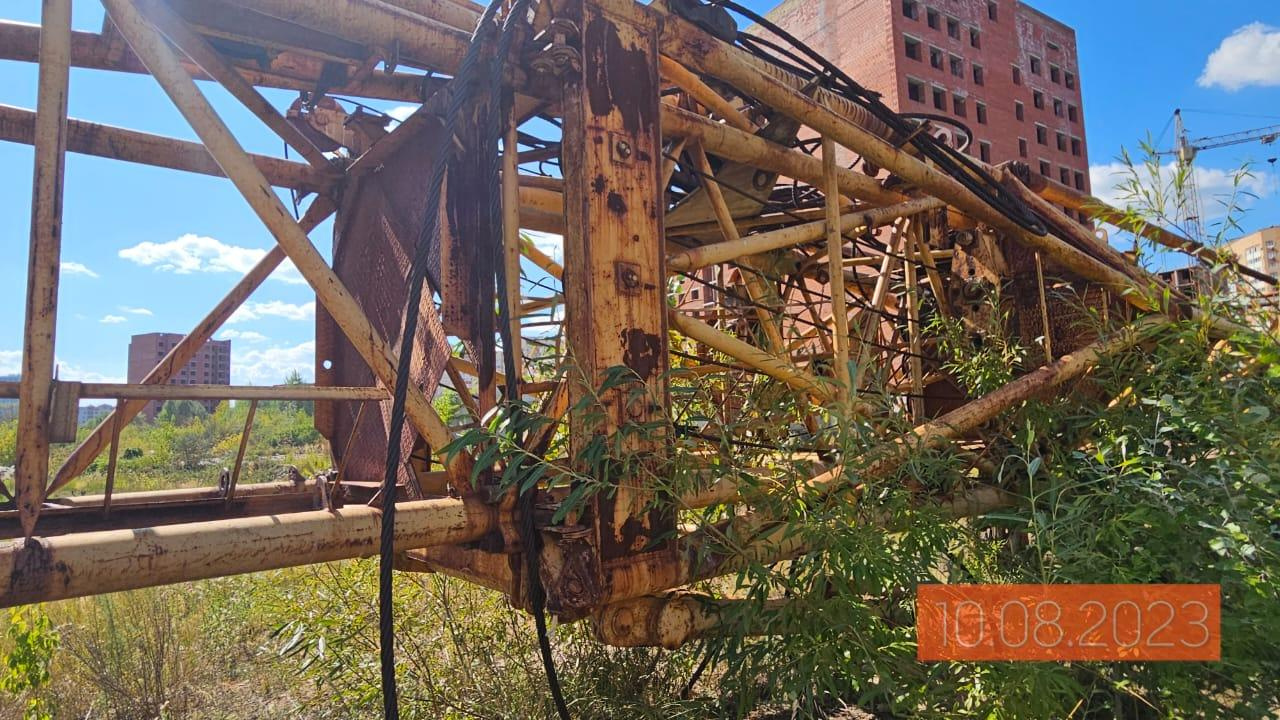 Кран башенный КБ-408.21 (60), 2006 г.в., зав.номер 260, Кран в разобранном состоянии, не поставлен на рельсы. Комплектность не полная. Поверхность крана покрыта коррозией, краска облупилась, подвижной рейсовый механизм и органы управления отсутствуют.