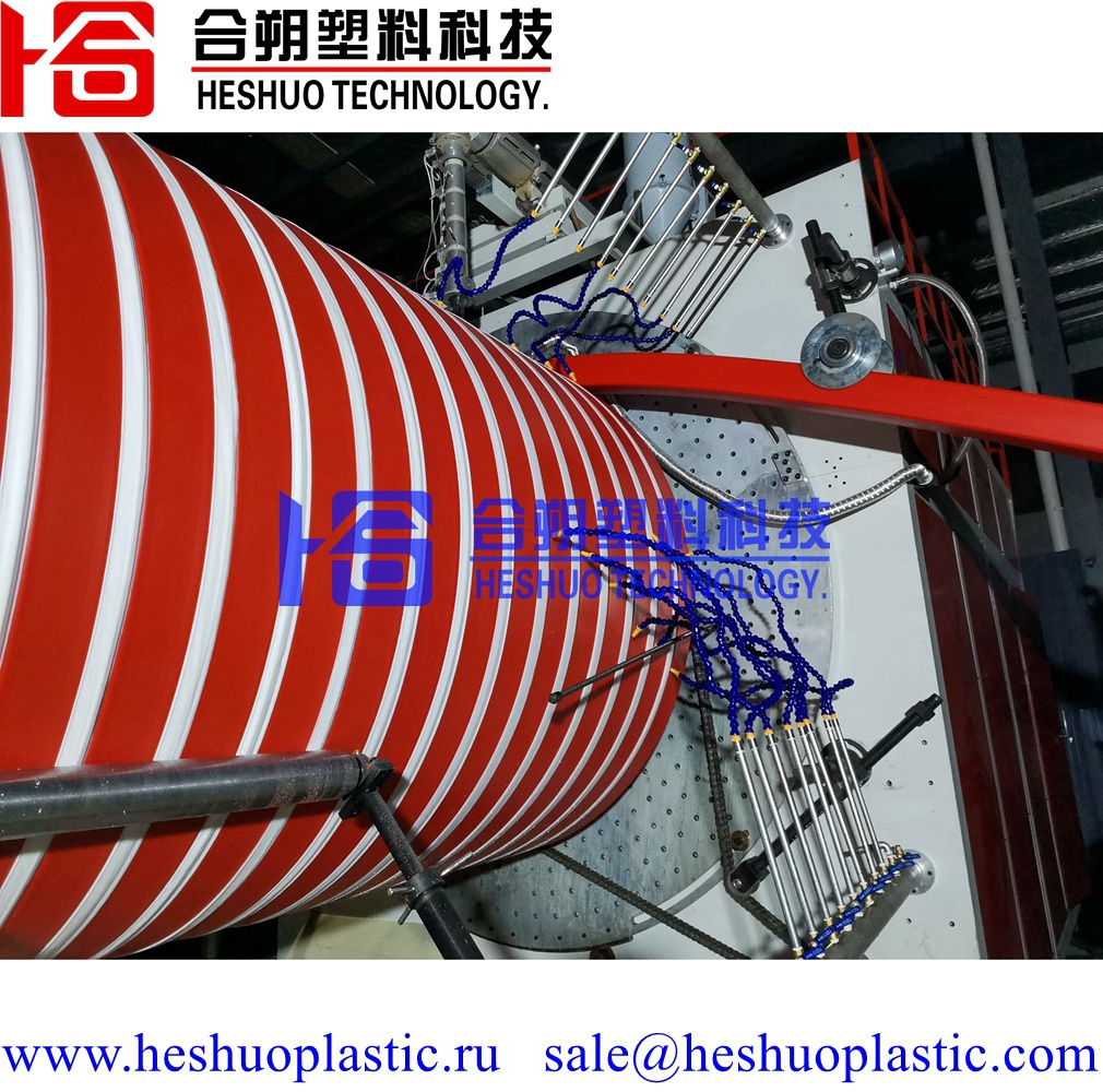 Линия по производству спиральновитых полиэтиленовых труб из квадратных профилей разработана нашей компанией для производства дренажных труб. Данная линия применяет технологию двухэтапного формирования-первый экструдер выпускает квадратную трубу и ее подает спирально в формирующий станок, второй экструдер выпускает полиэтиленые лент для покрытие спиральную трубу для окончательного формирования. С помощью изменения структуры данная линия возможна производить и пустотелых полиэтиленовых труб армированных стальными лентами.