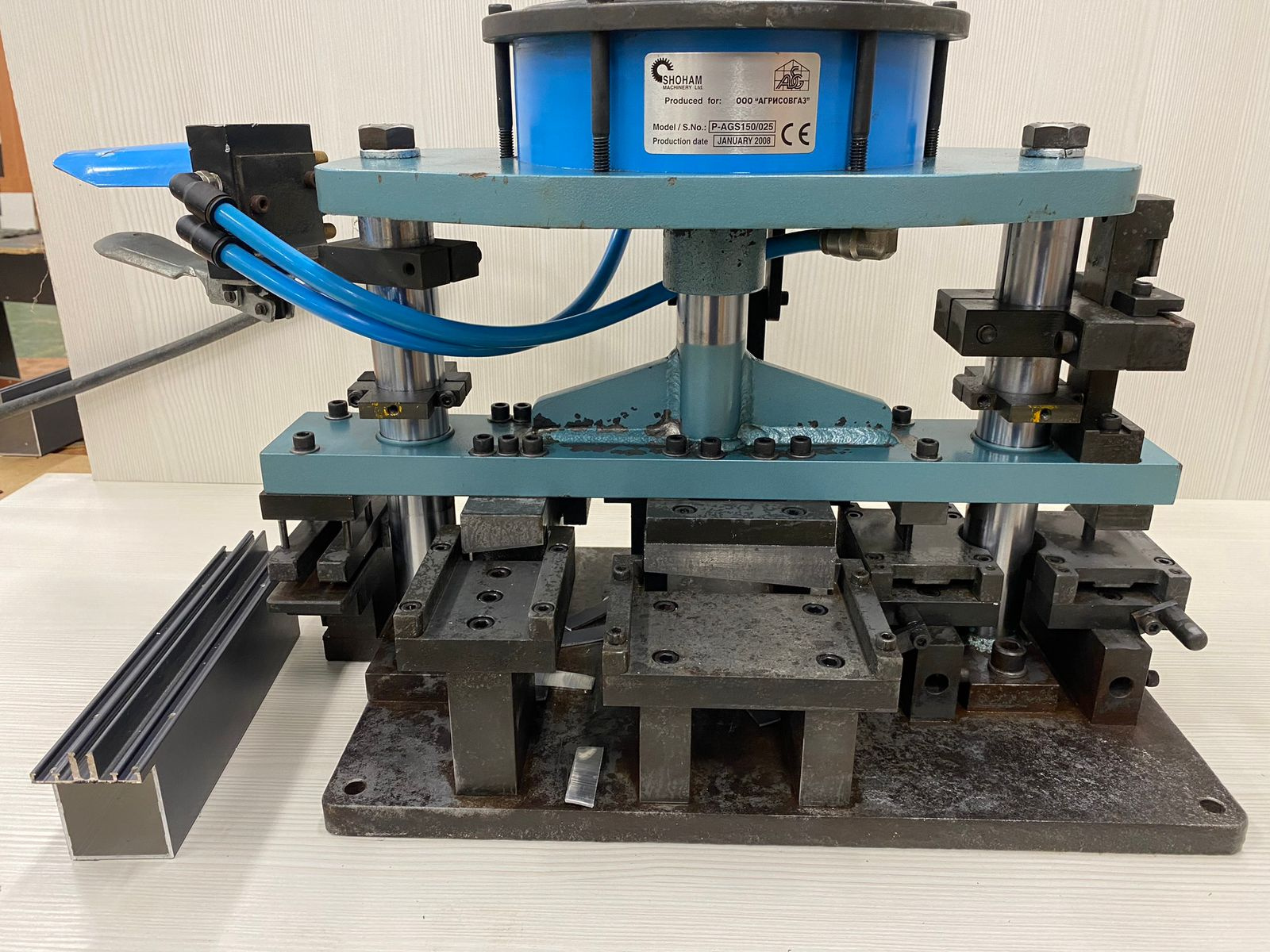 Пневматический малогабаритный пробивочный пресс-матрица (пневмопресс) P-AGS150 предназначен для холодной обработки профилей системы AGS150.В хорошем состоянии, полностью рабочий,8 операций,использовался редко. Страна производства Израиль. пробивка круглых отверстий в ригеле под саморезы 4 шт
