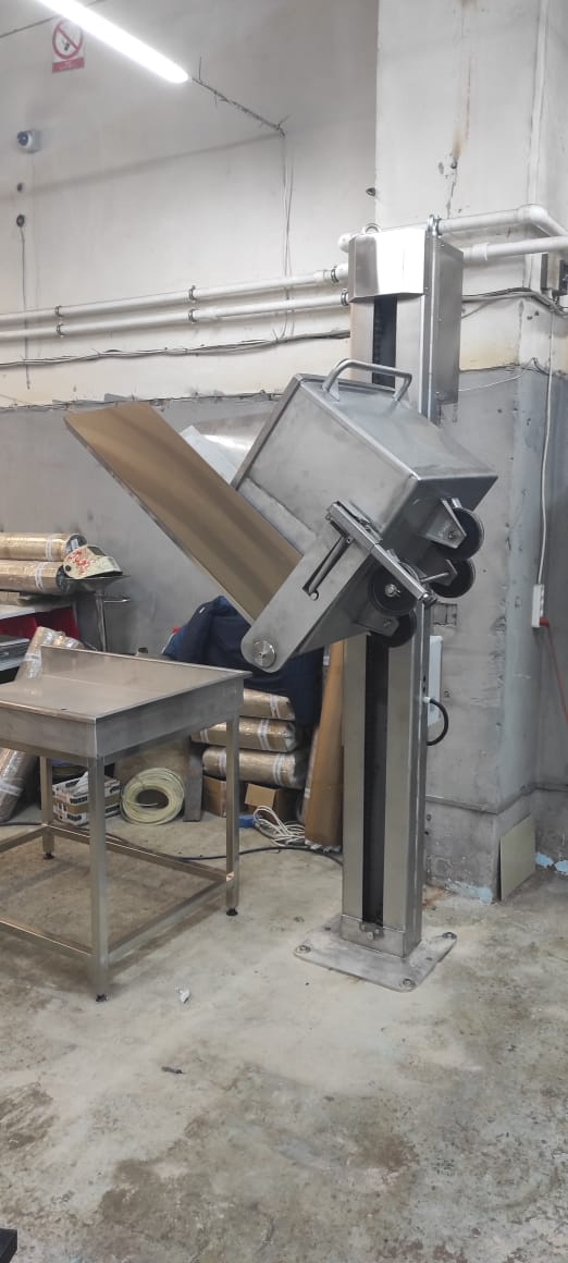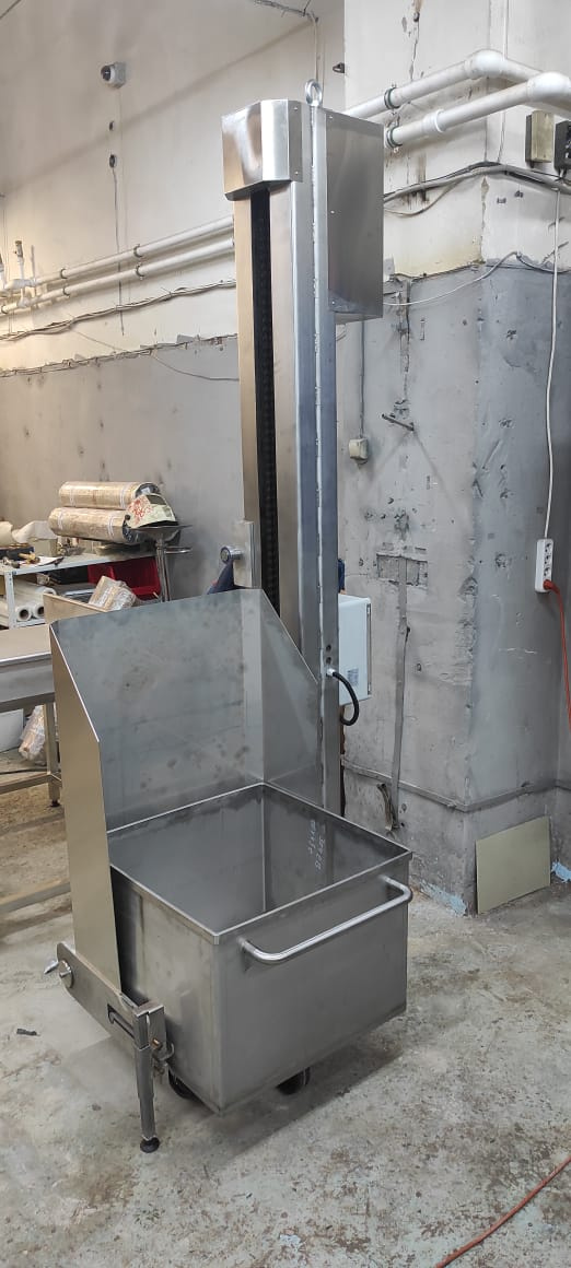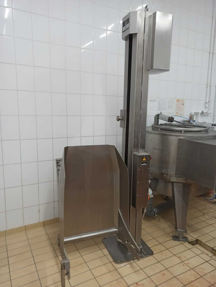 Подъёмное устройство с опрокидывателем рассчитано на объём перегружаемого груза 200 л (к заказу доступны варианты на 300 л). Это оборудование применяется большей частью на предприятиях по выпуску мясных и кисломолочных продуктов. Конструкция соответствует третьей категории согласно ГОСТ 15150-69 и может использоваться в умеренном климате.