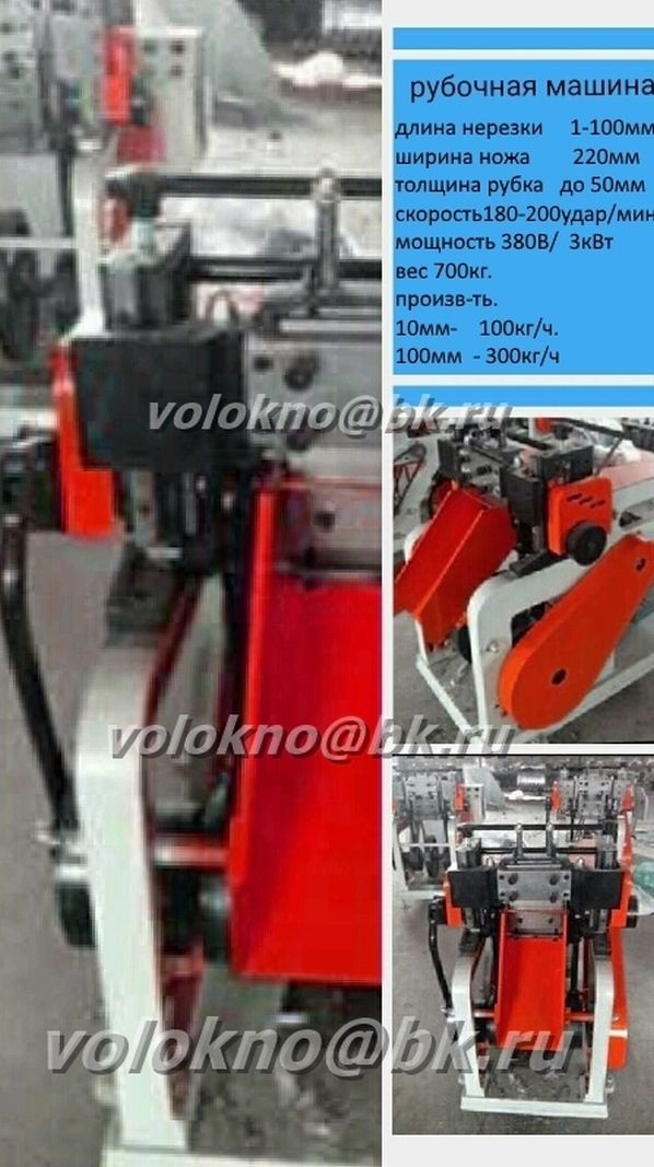 оборудование для рубки стекловолокна, искусственных нитей, тканей. Станок состоит из приемного устройства в виде двух резиновых прижимающихся между собой роликов, которые служат для подачи к режущим ножам сырья (стекловолокно, искусственные нити, ткани, и т. д.). Ножи имеют форму гильотинного типа и приводятся в движение электромотором мощностью 1,5- 3 кВт. Передача усилия происходит с помощью шестеренок, что обеспечивает надежность и долговечность в работе данного оборудования. Регулировка размера резки волокна.