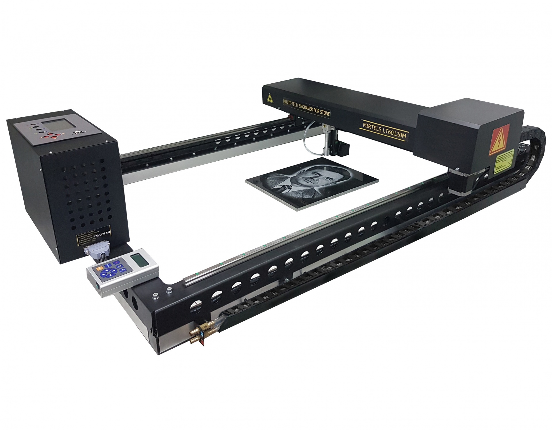 Комбинированные станки серии LT могут обрабатывать каменные заготовки, как ударной головкой, так и лазером. Размеры рабочей зоны станка LT60120M составляют 60 на 120 сантиметров.