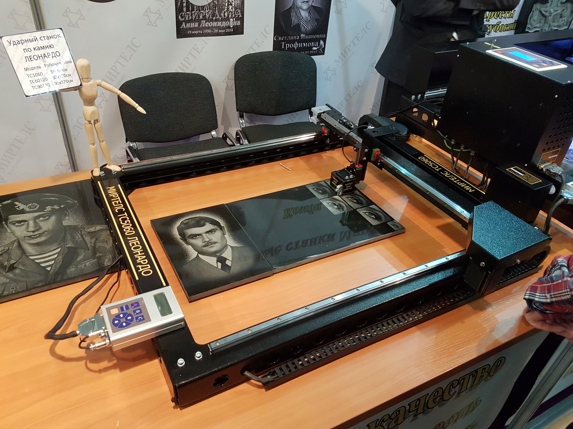 Современный ударно-гравировальный станок по камню Леонардо ТС5060, производимый компанией «Миртелс» – высокотехнологичный гравировальный станок ударного типа создает фотореалистичные изображения на многих видах каменных пород. Леонардо ТС5060 выполняет гравировку на таких видах камня как базальт, долерит, карельский габбро-диабаз, китайский габбро, украинский габбро, гранит и другие материалы. Основное назначение станка - создание на памятниках портретов и надписей различной сложности.