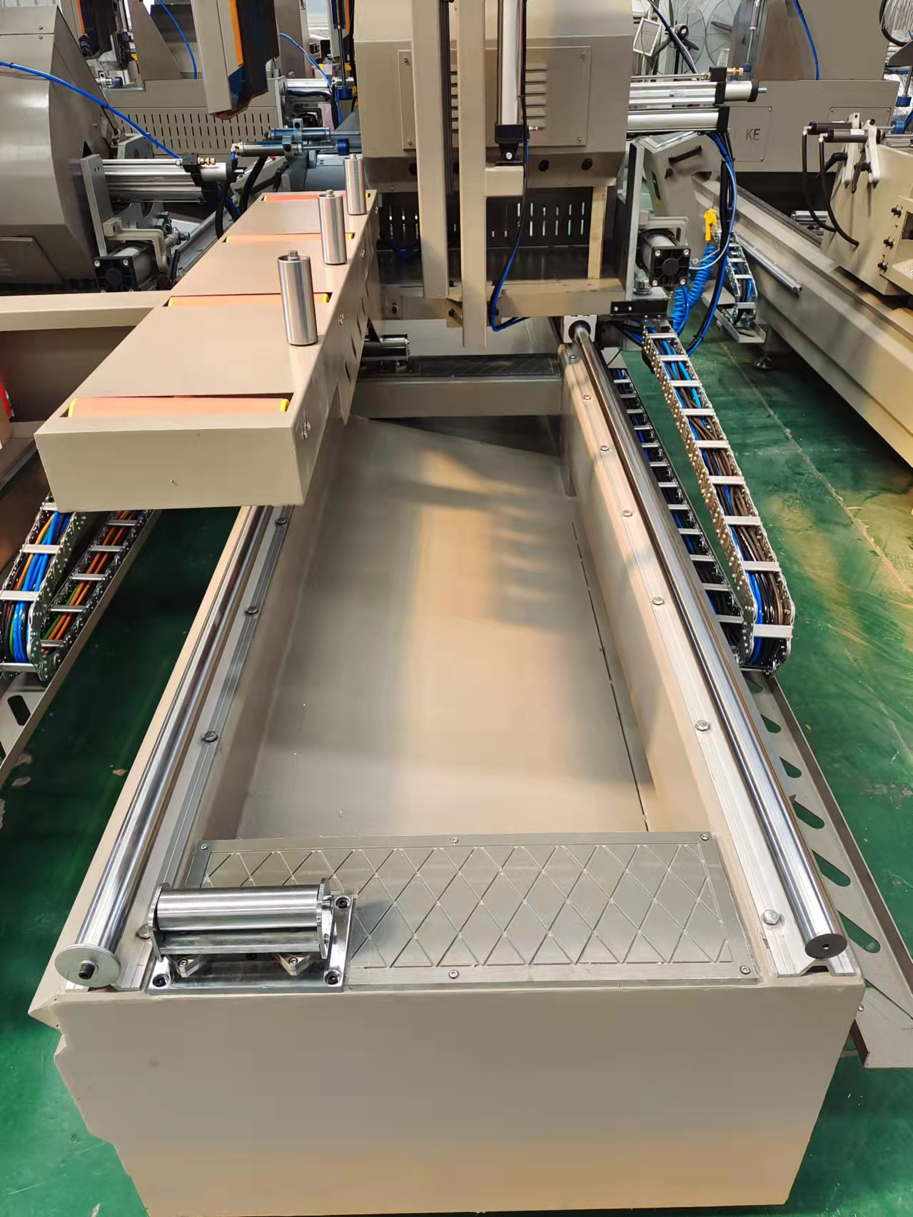 предназначена для резки ПВХ и алюминиевых профилей. Гидропневматическая подача обеспечивает мягкое опускание и поднятие пильного диска, скорость резки можно регулировать для резки разного материала. Левая голова неподвижная, правая может перемещаться вручную. Четкая регулировка длины с помощью электронного табло управления. Автоматически выставляемые углы резки 45 и 90 град, возможно резка под другими углами - настраивается вручную. В базовую комплектацию включена система охлаждения пильных дисков, вертикальные и горизонтальные прижимы профиля.