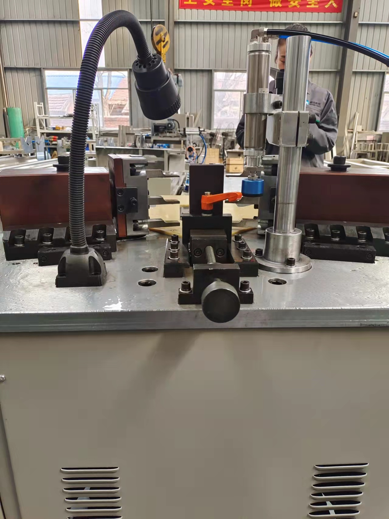 Станок предназначен для производства дверей и окон из алюминиевого профиля и подходит для соединения угловых конструкций под углом 90 градусов. Позиционирование регулируется вверх и вниз, что подходит для обработки профилей различной формы и размера поперечного сечения. Левый и правый пуансоны подаются синхронно с жесткостью, что позволяет избежать бесполезной деформации в процессе формирования углов и делает соединение углов окна более прочным. Синхронный механизм подачи упрощает регулировку машины.