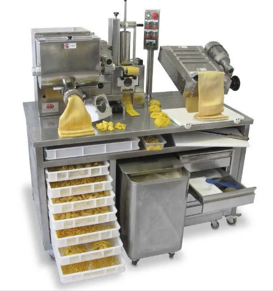 PASTATION – это аппарат для производства свежей пасты различных видов, состоящий из единого модуля средних размеров, и представляющий собой настоящий профессиональный мини-цех для производства пасты. Емкость пресса-тестомеса для подготовки основного теста рассчитана на 8 кг (мука и жидкость) и оборудована съемным валом для легкой очистки и системой водяного охлаждения головки. Устройство для нарезки длинной и короткой пасты позволяет приготовить большое количество разных видов пасты: гладкие или рифленые макароны, фузилли, спагетти, паккери, букатини, джильи, казаречче. Валики для раскатки и нарезки теста из нержавеющей стали позволяют легко раскатать лист теста шириной 200 мм до необходимой толщины и приготовить тальолини, тальятелле, феттучине и папарделле шириной 2-4-6-12 мм.