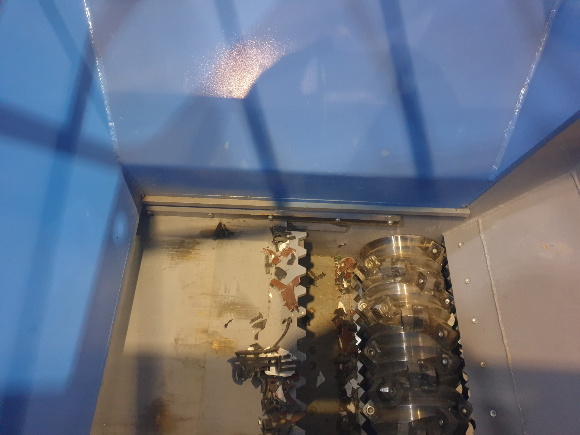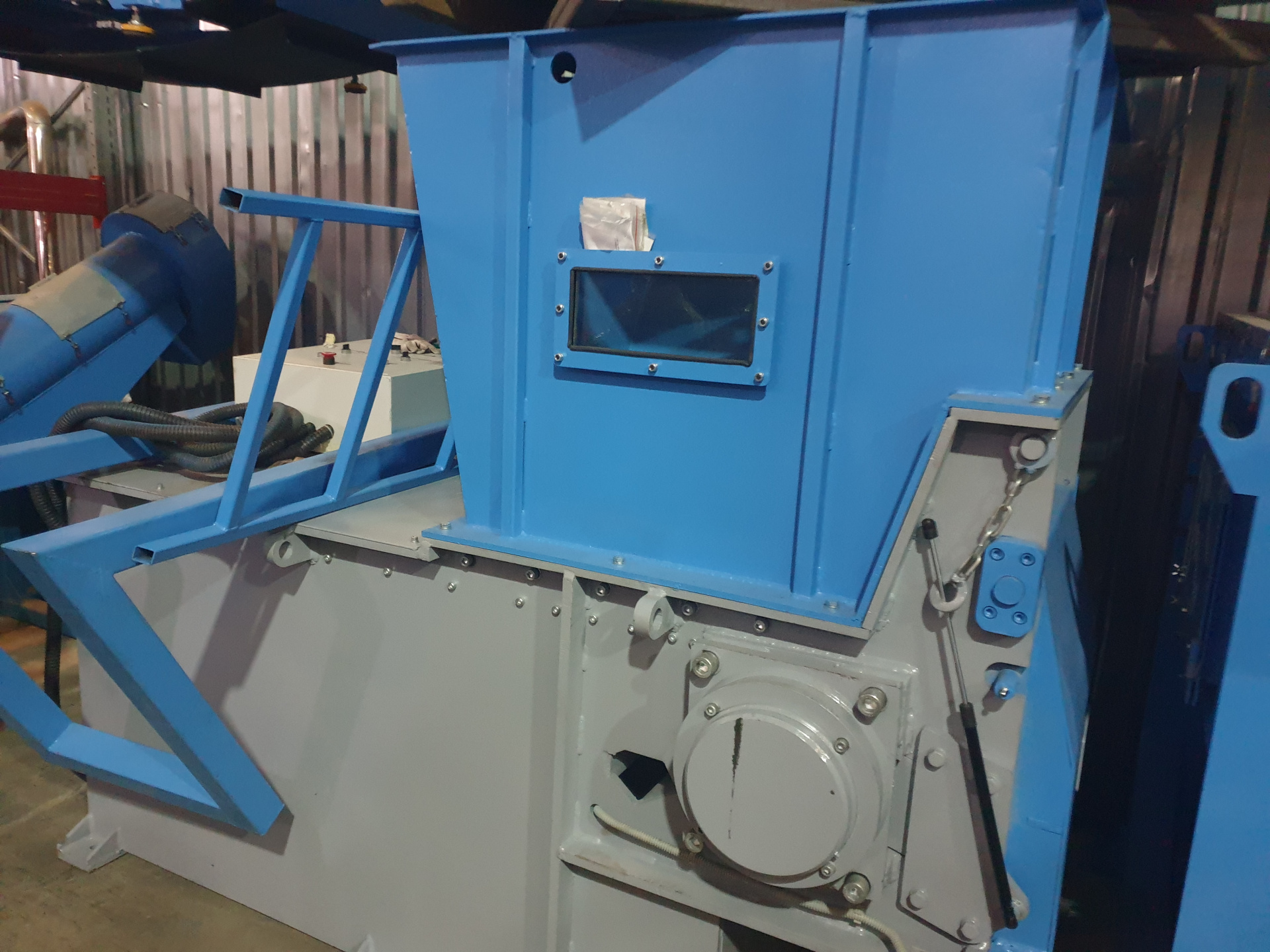 Шредер одновальный это оборудованию для предварительного дробления твердых материалов. Конструкция предусматривает наличие роторных и стационарных ножей. При прохождении между ними сырье измельчается на более мелкие составляющие. Вращение ротора происходит с частотой 25-100 об/мин, что позволяет измельчать трубы, литники и другие трудные для переработки материалы.