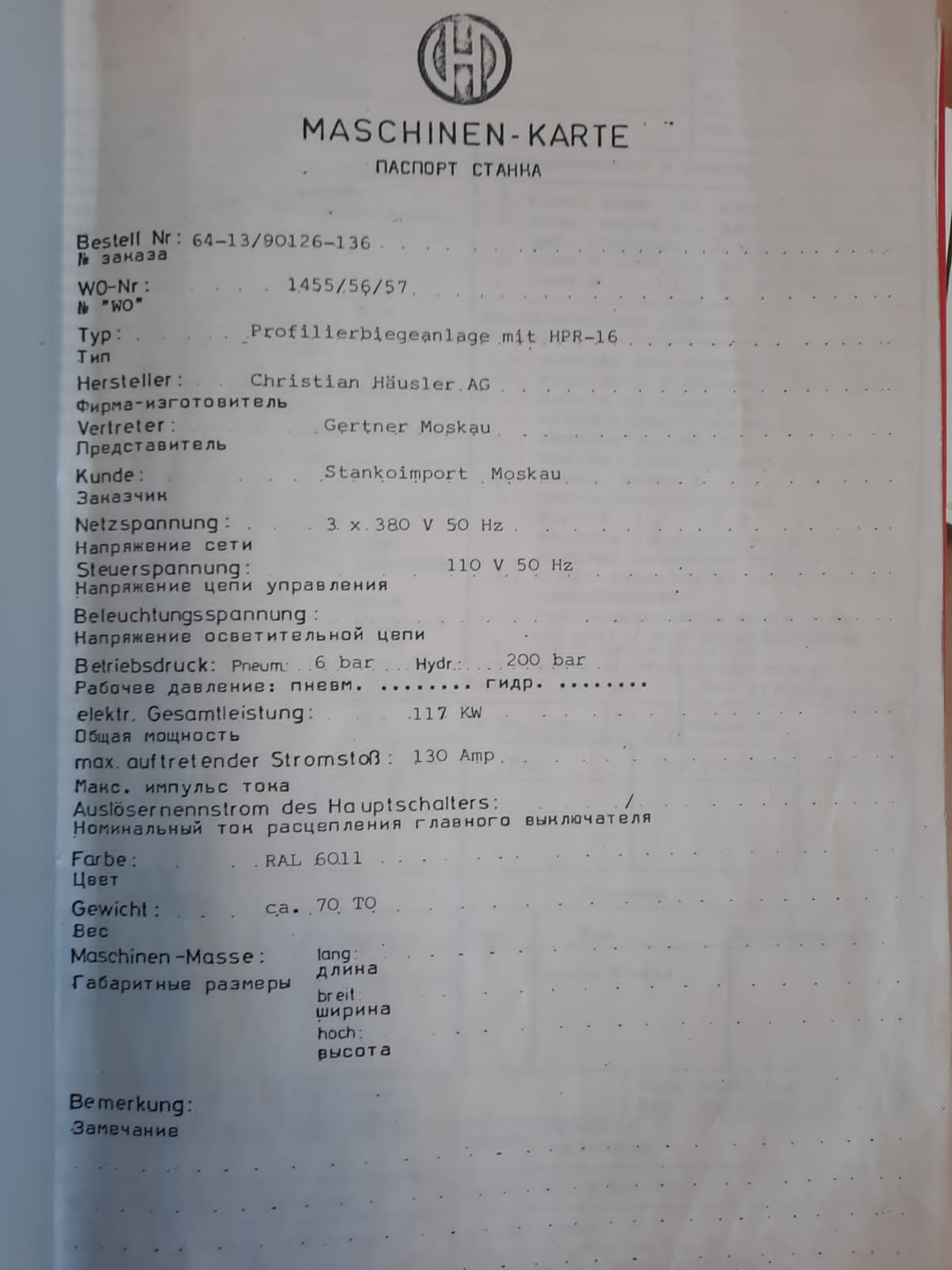Предприятие реализует профилеровочно-гибочную машину HPR-16 (вальцы, ФРГ).