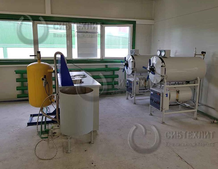Автоклав имеет собственный тэновый парогенератор, кроме этого автоклав возможно подключить к внешнему источнику пара. Узлы, контактирующие с водяным паром, выполнены из нержавеющей стали. Для облегчения загрузки пресс-форм каждый автоклав имеет выдвижную корзину, благодаря которой пресс-формы оказываются в центре камеры. Режим обработки может варьироваться в широком диапазоне как по температуре 40-135ºС так и по времени 0-60 мин. Нагрев пресс-форм осуществляется равномерно со всех сторон. Контроль температуры внутри камеры осуществляет термопара, передающая сигнал на регулятор. По завершению времени тепловой обработки давление в камере сбрасывается. Дверь автоклава разблокируется. Это гарантирует безопасность работы персонала.