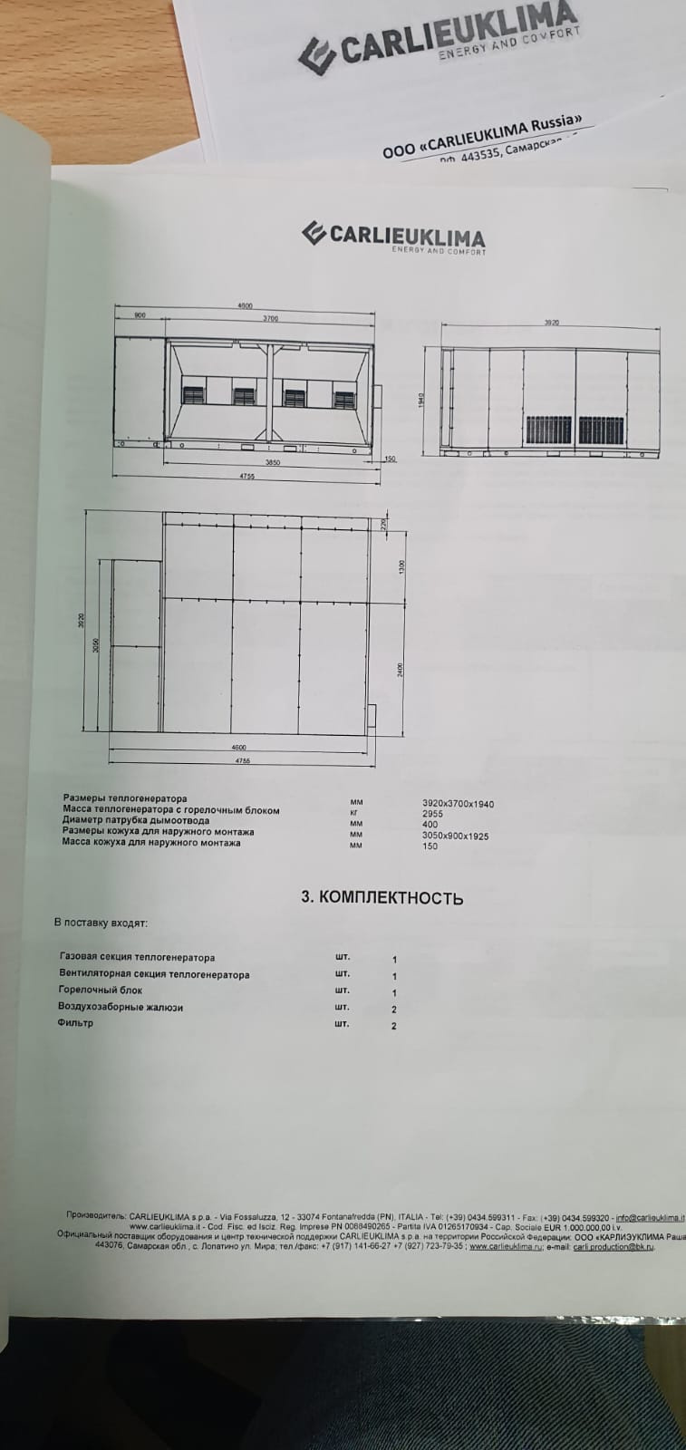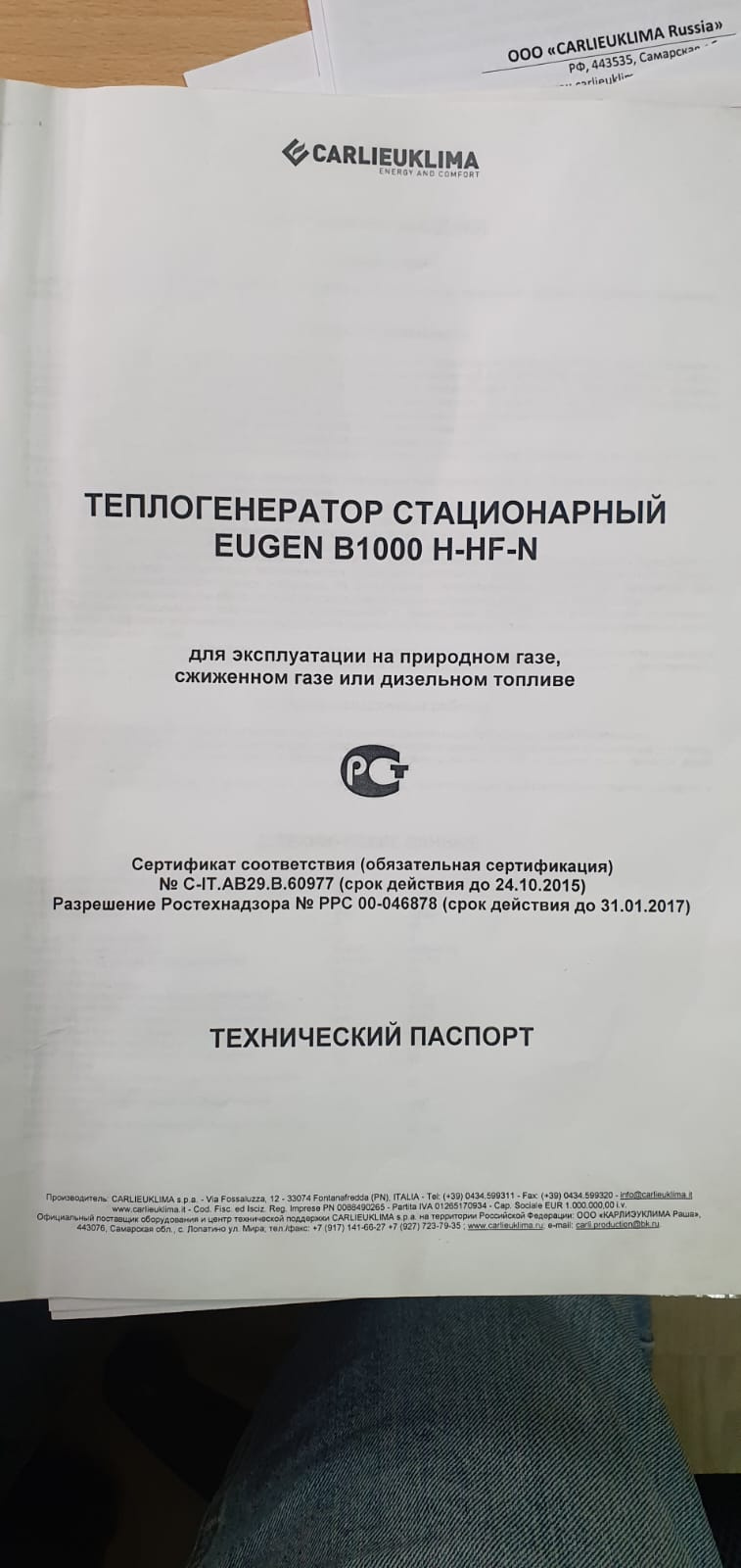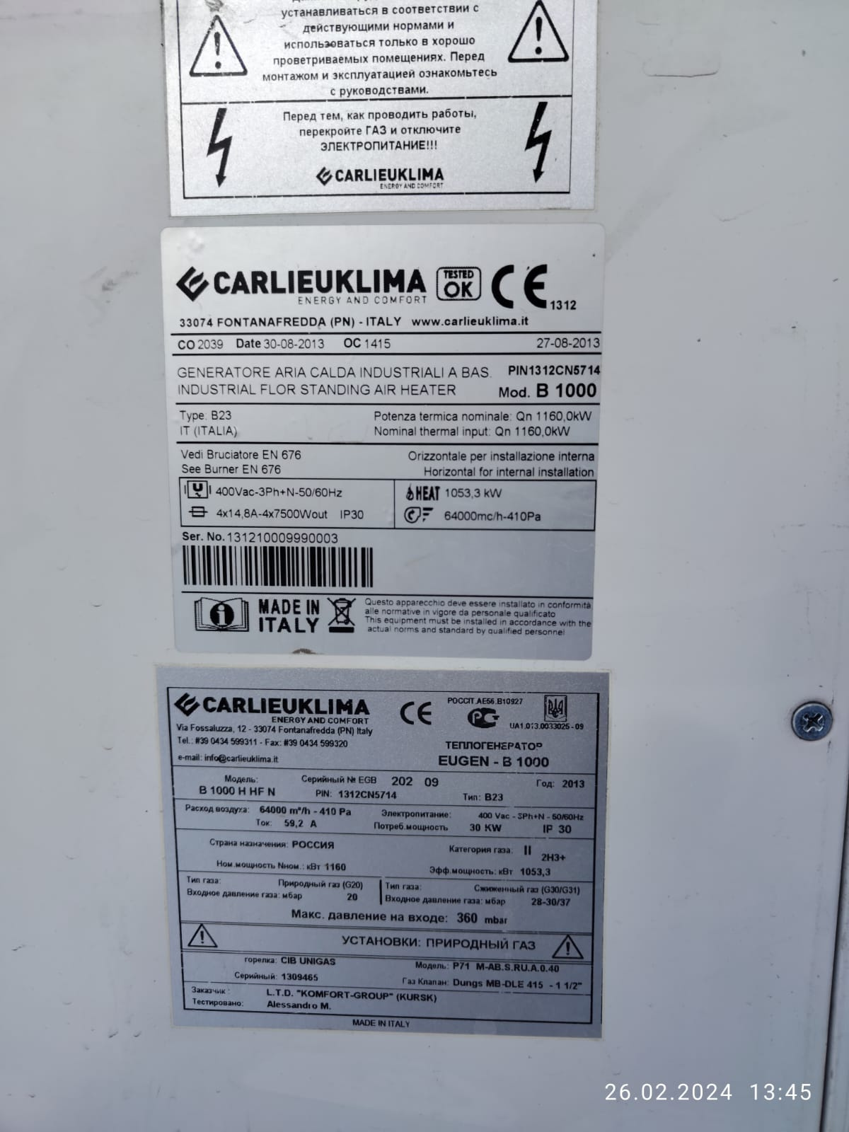 Продается Газовый теплогенератор стационарный Итальянской фирмы CARLIEUKLIMA Модель EUGEN B1000 H-HF-N. Год выпуска август 2013г. В отличном рабочем состоянии. Был установлен для отопления производственного помещения и фактически не использовался.Теплогенератор EUGEN с принудительной циркуляцией воздуха, будет являться хорошим решением для обогрева производственных и коммерческих площадей. Внешний вид и подробные технические характеристики на прикрепленных фото.Газовая горелка CIB UNIGAS P71. Идет вместе с теплогенератором.