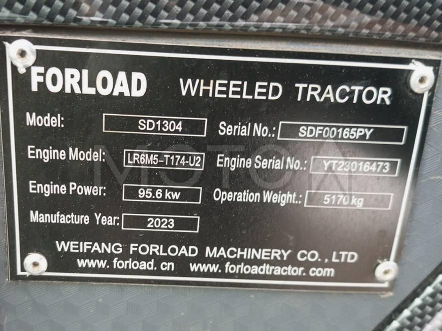 Трактор колесный FORLOAD SD1304, 2023 года выпуска. Счетчик моточасов 426 часов. Тип двигателя Дизельный, YTO мощность 130 л.с. Рабочий объем 7700 куб.см. Идентификационный номер: SDF00165PY.