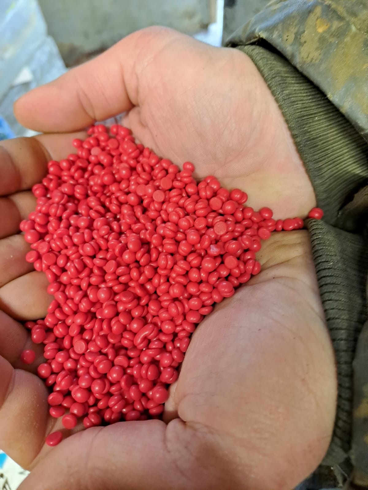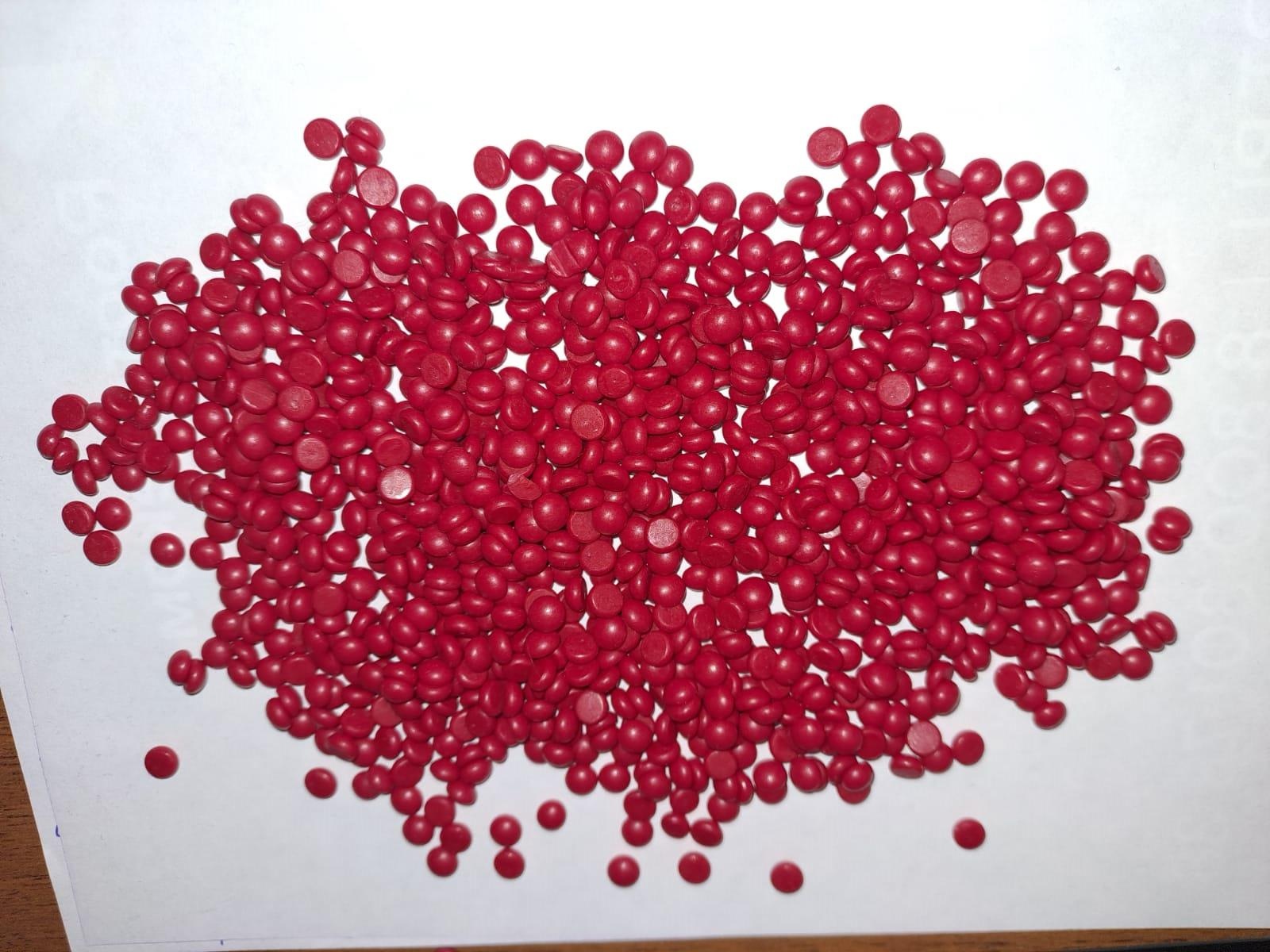 В виде гранулы. Цвет ярко-красный. Богатый насыщенный цвет. Мешки по 25кг.