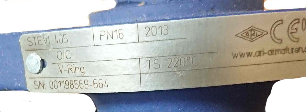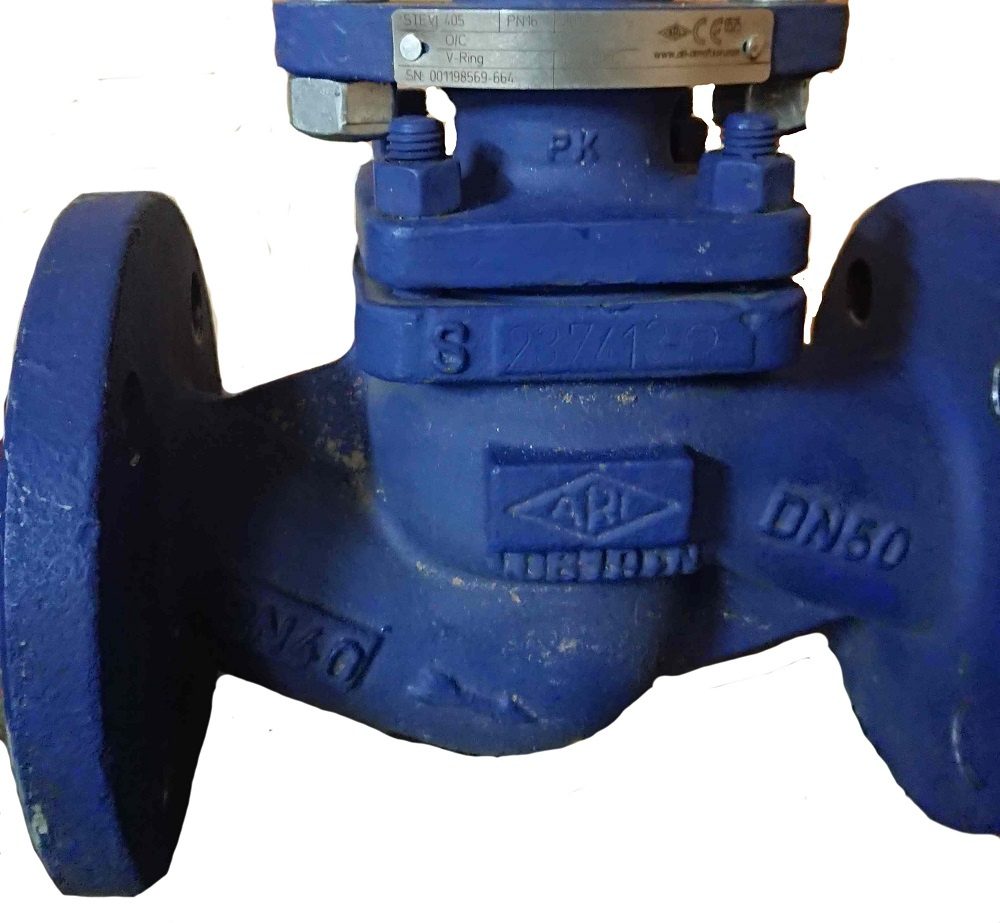 Клапан отсечной ARI-STEVI 32.405 DN50 PN16 c пневматическим приводом DP32HNV. Маркировка: STEVI 405 PN16, серийный номер 001198569-664, TS 220°C. Год выпуска 2013. Оборудование бывшее в употреблении. Из Германии.
