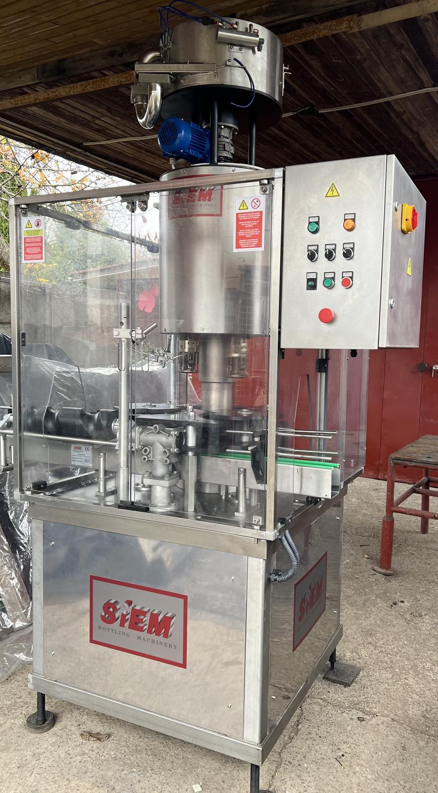 Машина укупорочная Siem srl для стеклобутылок револьверного типа производительностью до 6000 бут/час. В комплекте 4 закаточные головки под винтовой алюминиевый колпачок, ворошитель.