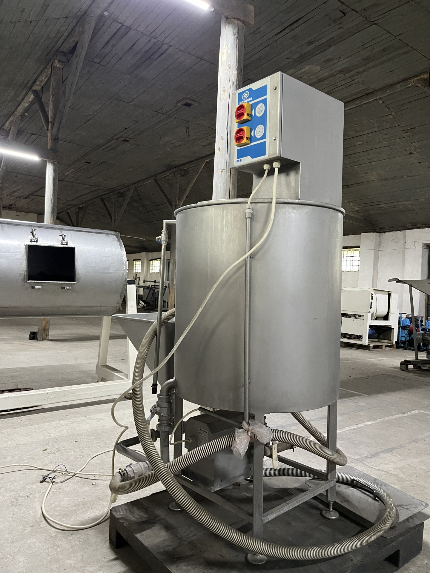 Мешалка рассола позволяет получать гомогенные солевые растворы, используемые в процессах производства мясных продуктов. Она имеет двойную систему перемешивания рассола — механическую и инжекционную, что обеспечивает быстрое получение однородных рассолов. Центробежный насос