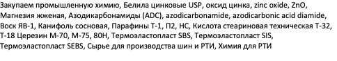 Закупаем промышленную химию, Белила цинковые USP, оксид цинка, zinc oxide, ZnO, Магнезия жженая, Азодикарбонамиды (АDС), azodicarbonamide, azodicarbonic acid diamide, Воск ЯВ-1, Канифоль сосновая, Парафины Т-1, П2, НС, Кислота стеариновая техническая Т-32, Т-18 Церезин М-70, М-75, 80Н, Термоэластопласт SBS, Термоэластопласт SIS, Термоэластопласт SЕВS, Сырье для производства шин и РТИ, Химия для РТИ