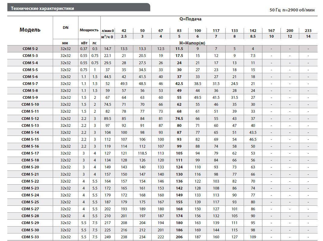 Насосы серии CDM - вертикальные, многоступенчатые, центробежные, повысительные, оснащены двигателем YE3. Входной и выходной патрубки находятся на одной оси. Насосы могут изготавливаться из стали AISI 304, AISI 316 и чугуна.Многоступенчатые насосы серии CDM из нержавеющей стали подходят для промышленных технологических систем, систем промывки, перекачки кислот и щелочей, систем фильтрации, повышения давления воды, очистки воды, ирригации, систем противопожарной защиты и т.п.Тип: вертикальный многоступенчатый насос