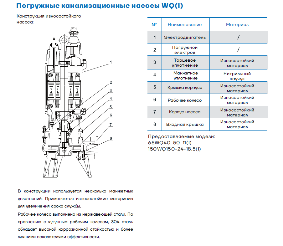 Погружной канализационный насос CNP серии WQ комплектуется двухканальным рабочим колесом, которое предотвращает засорения шахты насоса и исключает появление турбулентных завихрений, что гарантирует стабильную работу агрегата в самых неблагоприятных условиях. Диаметр прохода твердых тел от 15 до 40 мм в зависимости от модели позволяет использовать их без измельчителя (режущего механизма). Корпус изготовлен из чугуна, электродвигатель надежно защищен от попадания жидкости, даже при повреждении крышки насоса, а в масляной камере установлен датчик, который извещает о повреждении торцевого уплотнения. Применение: жилищно-коммунальное, сельское хозяйство, промышленное строительство, горная промышленность, отвод канализационных стоков, промышленных стоков, дренаж затопленных котлованов и болотистой местности.