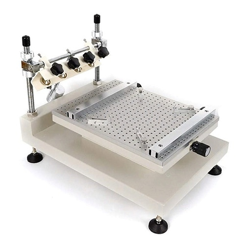Быстрая регулировка стола по осям Х, Y и по высоте с помощью удобных ручек. Надежное крепление для трафаретных рам с помощью 4 винтов.