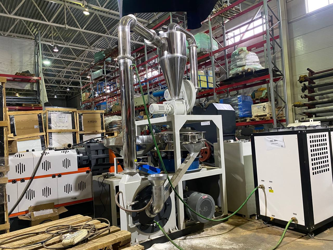 Мельница ножевая (роторная) измельчает во фракцию от 12 мм до 1000 мкм путем истирания материала в порошок. В наличии мельницы ножевые и дисковые, оснащенные пылеуловителями, несколькими контурами охлаждения. Применяют для ПВХ, ПНД, ПВД, ПП, ПС, АБС гранулы, дробленки. Подходит для не вязких материалов (корень родиолы, сажа, пробковое дерево, мускатный орех и тд). Производительностью от 150 до 400 кг в час