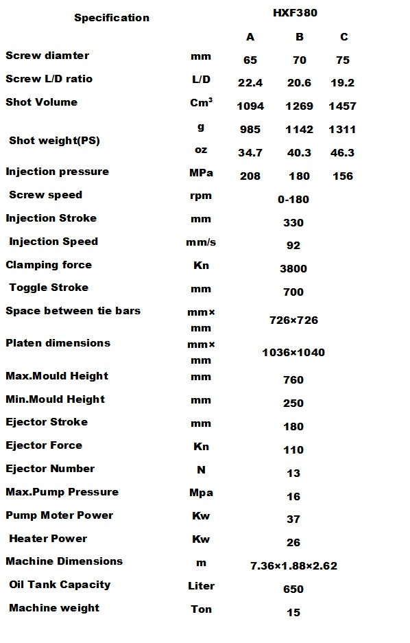 ТПА Haixing Модель HXF 380. Выпуск июнь 2017 г.в. Один собственник. Начало эксплуатации -ноябрь 2018 г. Смыкание 380 тонн. Шнек 70 мм. Впрыск 1269 см3/ 1142 гр. Давление впрыска 1800 бар. Между колонн 726×726 мм. Плиты 1036*1040 мм. Ход плиты 700 мм. Высота п/ф 250-760 мм. Мощность нагревателей 26 кВт. Мощность эл.дв. 37 кВт. Насос 37 кВт. Объем масла 650 л. Вес 15т. Габариты 7.36×1.88×2.62м. В отличном техническом состоянии.