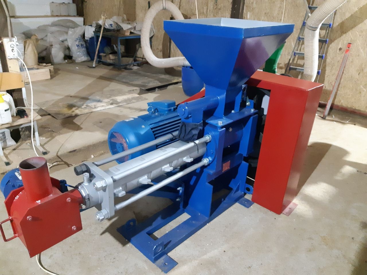 Электродвигатель установлен на отдельной раме, что облегчает транспортировку и установку экструдера.