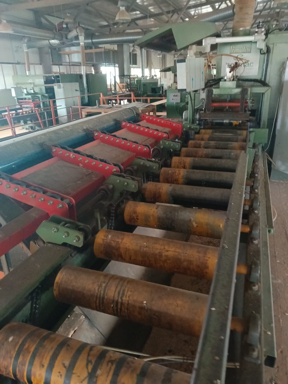 4. Автоматическая линия для производства обрезного пиломатериала Рrimultini . Год выпуска: 2013. Центрующее устройство для правильной подачи необрезного пиломатериала на станок, Автоматизированный многопильный станок. Приводной рольганг длиной 4500 мм с отделителем обрезного пиломатериала от некондиционного на выходе, Приводной рольганг длиной 4010 мм в комплекте со сбрасывателем для перемещения готовой продукции к месту погрузки.