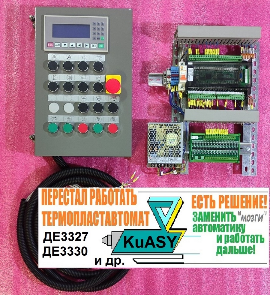 Этот комплект, состояний из панели управления с монохромным дисплеем 3,7" и программируемым контроллером может быть использована как аналог существующей электроники для немецкого термопластавтомата KuAsy (КУАСИ):