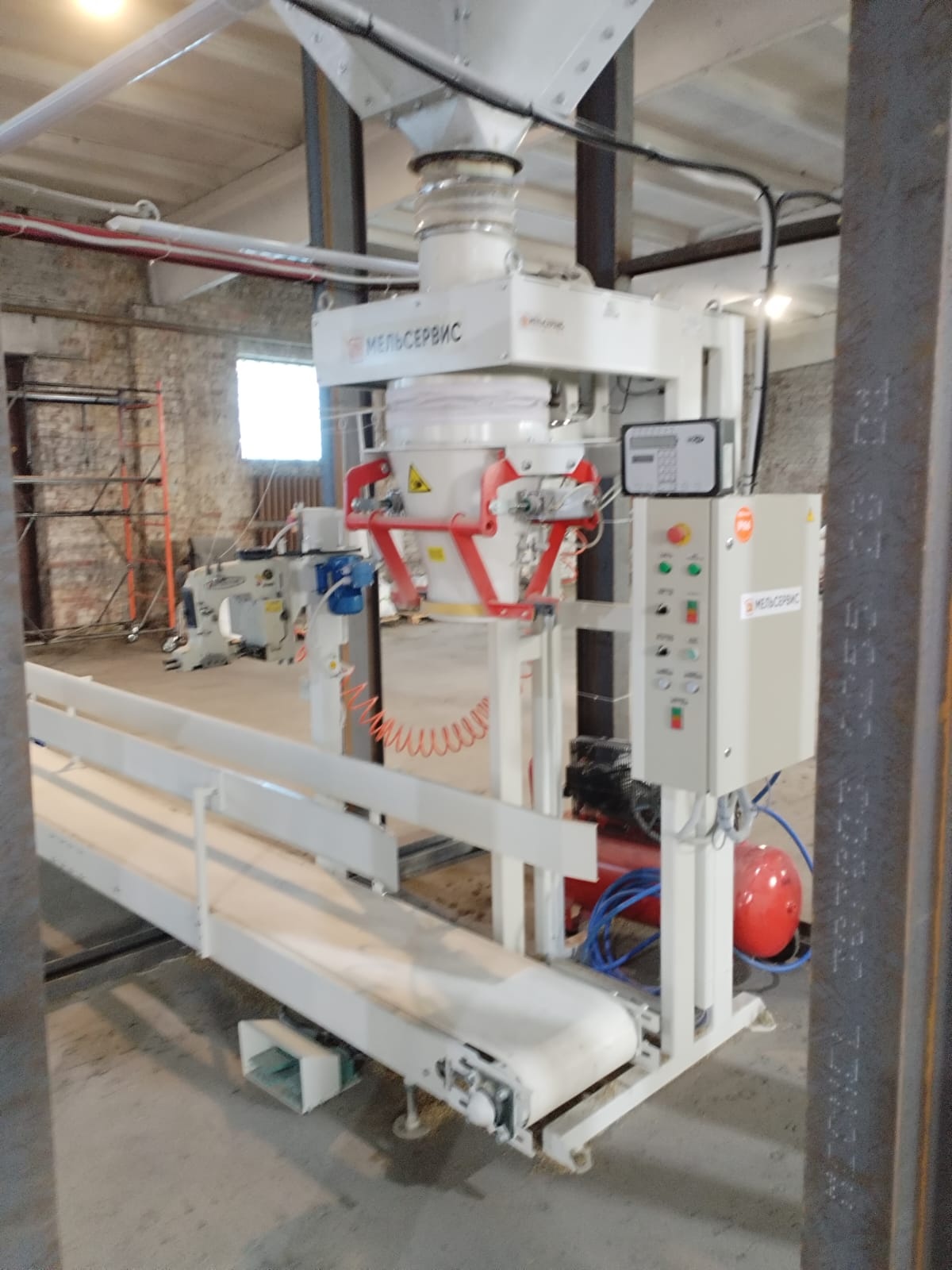 Продам линию фасовки от компании Мельсервис МВД-МС-50-ВФ-Б, бу - 5 месяцев, также в комплект входит зашивочный конвейер с устройством разворота мешка, мешкозашивочная машина GK-35-6 с компрессором Fubag.