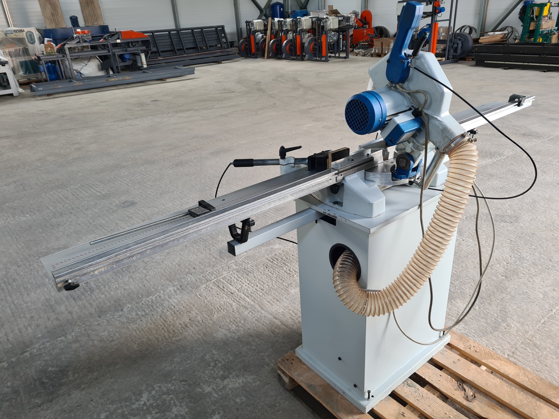 Станок с одним пильным диском и встроенной системой аспирации, укомплектован вращающимся столом, самоцентрирующейся блокировкой в основных углах 45; 30; 22,5; 15; 10; 0 град. слева и справа и ручной блокировкой промежуточных углов. Индикация угла по шкале. Данная модель имеет прямой привод.