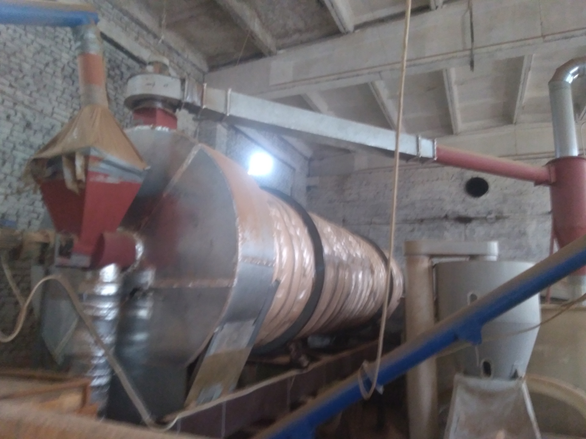 4. Сушильный комплекс барабанного и аэродинамического типа (теплогенератор сухим воздухом без топочных газов с пультом управления и предохранительным клапаном от воспламенения, сушилка двухпроходная барабанного типа, улитки пылевая и высокого давления, циклон-пылесборник) производительность 500-1500кг/час суммарная мощность 12кВт.