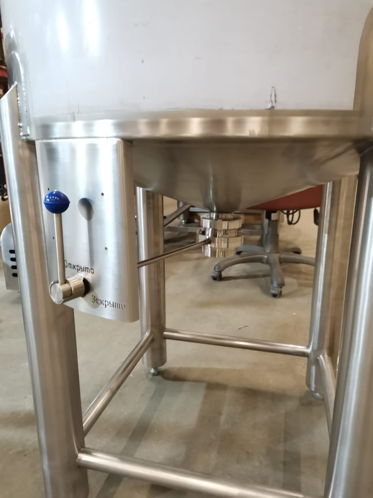 Однослойная емкость из нержавеющей стали AISI 304, без объемной рубашки и без утепления. Откидные крышки. Служит в качестве приёмной и накопительной емкостью перед розливом.