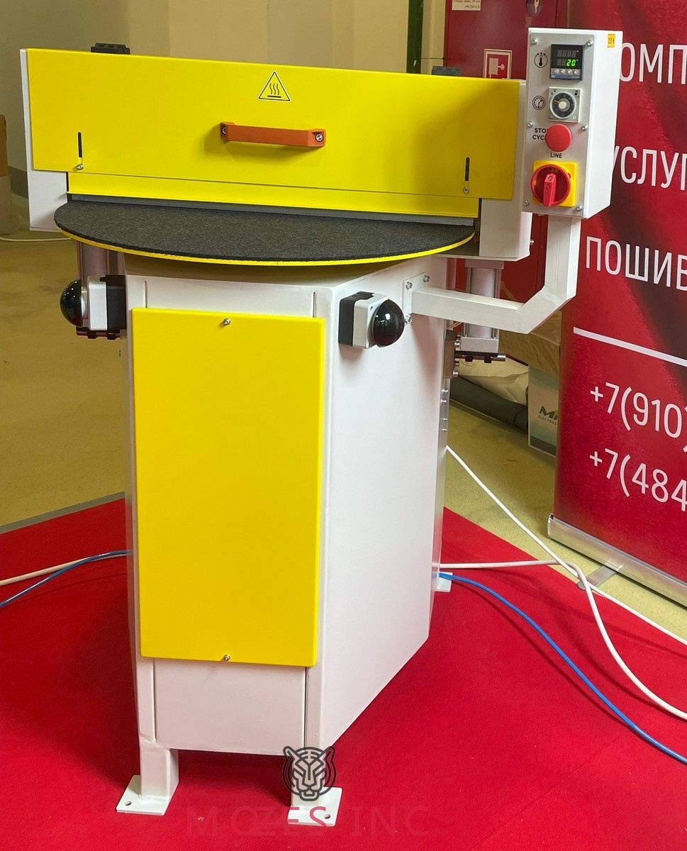 Оператор загружает и разгружает материал, до и после операции термодублирования, оставаясь в том же самом положении. Фактическая рабочая поверхность составляет 700 мм в диаметре, в то время, как поверхность, используемая для выполнения операции прессования, составляет половину этого (диаметром 350 мм). Зона прессования имеет тефлоновое покрытие.