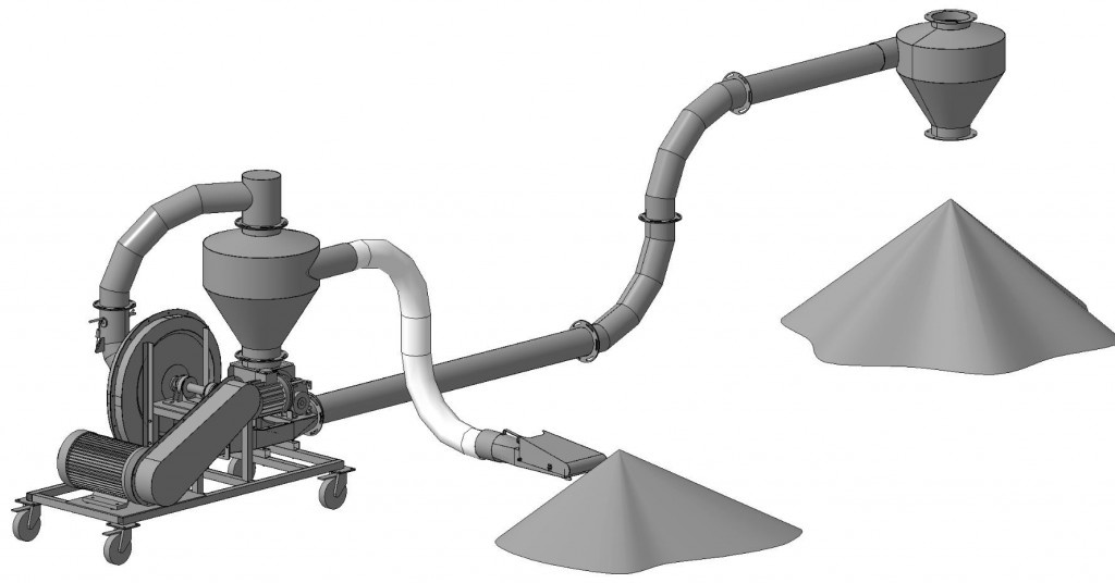 Пневматические транспортеры всасывающе - нагнетательные предназначены для транспортировки зерна в горизонтальном и вертикальном направлении. Могут быть использованы для разгрузочных работ, таких как: перегрузка зерна с призмы, хранилищ или башни с загрузкой на транспортное средство и наоборот. Зерно всасывается соплом, которое находится на конце эластического шланга, а потом циклоном и через дозатор зерно подается трубопроводом в нужное место.