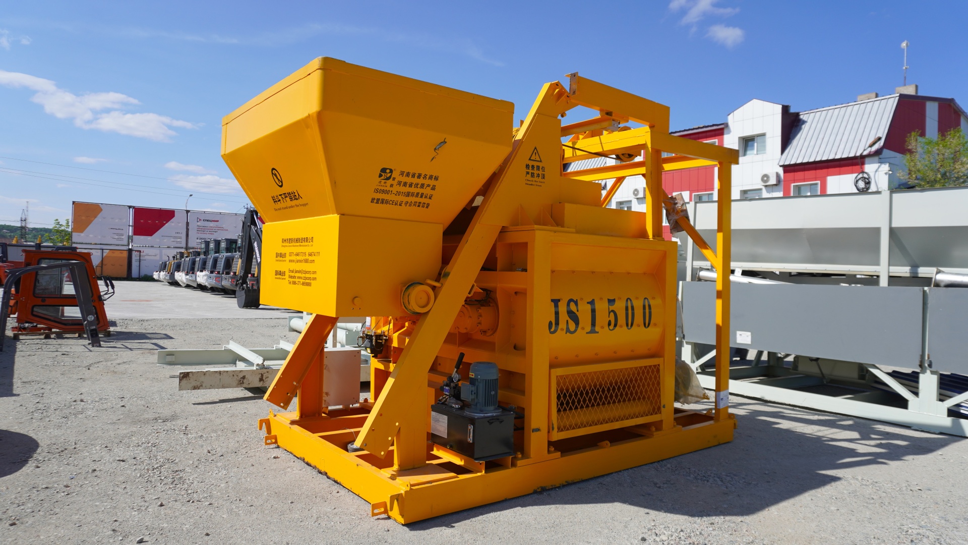 1. Двухвальный бетоносмеситель JS1500: объем готового замеса - 1500 л; высота выгрузки - 3.8 м; мощность электродвигателя - 30 кВт Х 2; скип объемом 2400 л; разгрузочный цилиндр; разгрузочная емкость