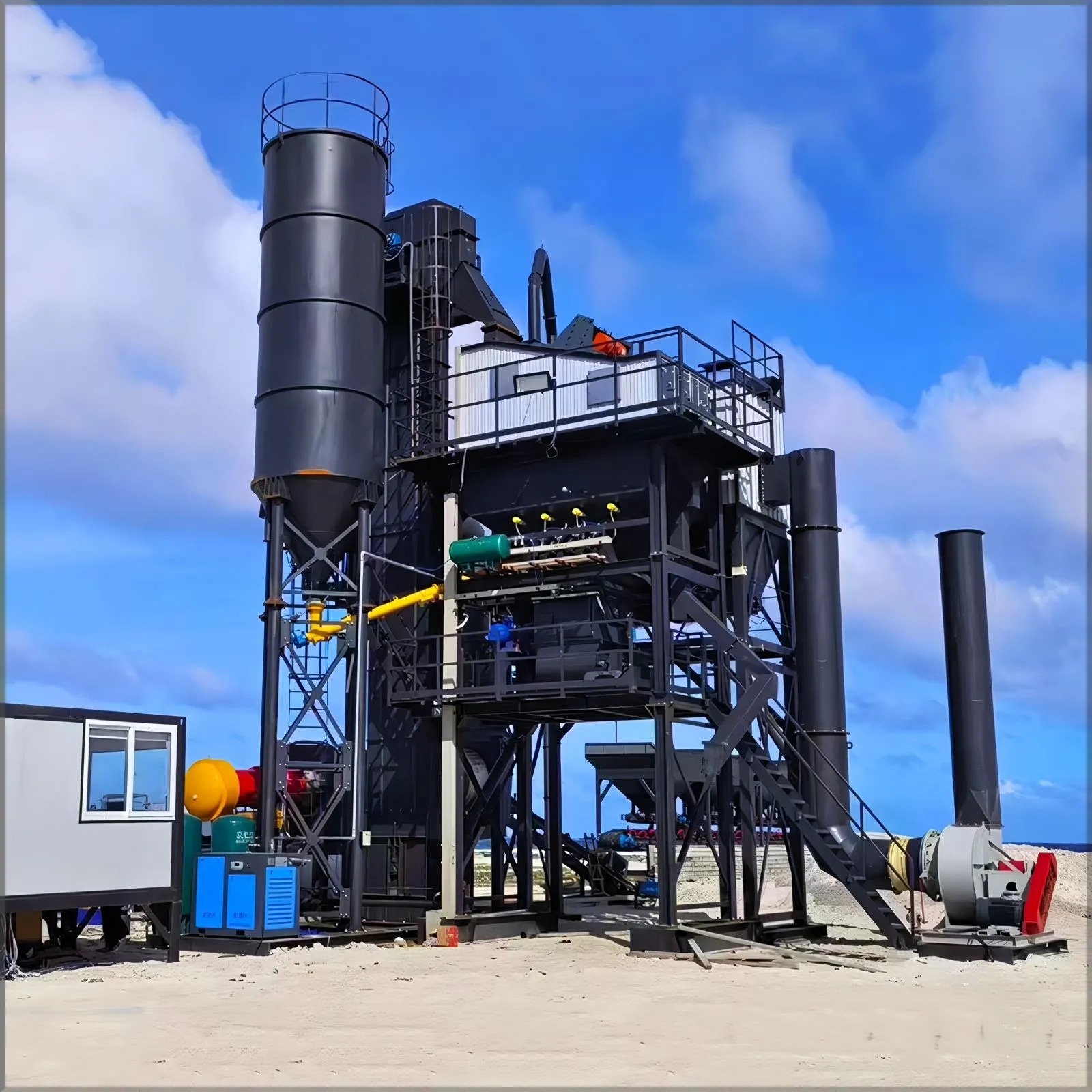 Силосы минерального порошка объемом 30m³ (второй этаж) и 15m³ (первый этаж).