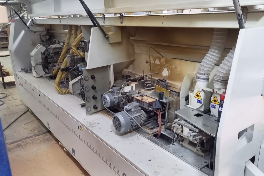 · с двумя независимыми высокочастотными двигателями для обрезки свесов кромочного материала с переднего и заднего торцов плиты.