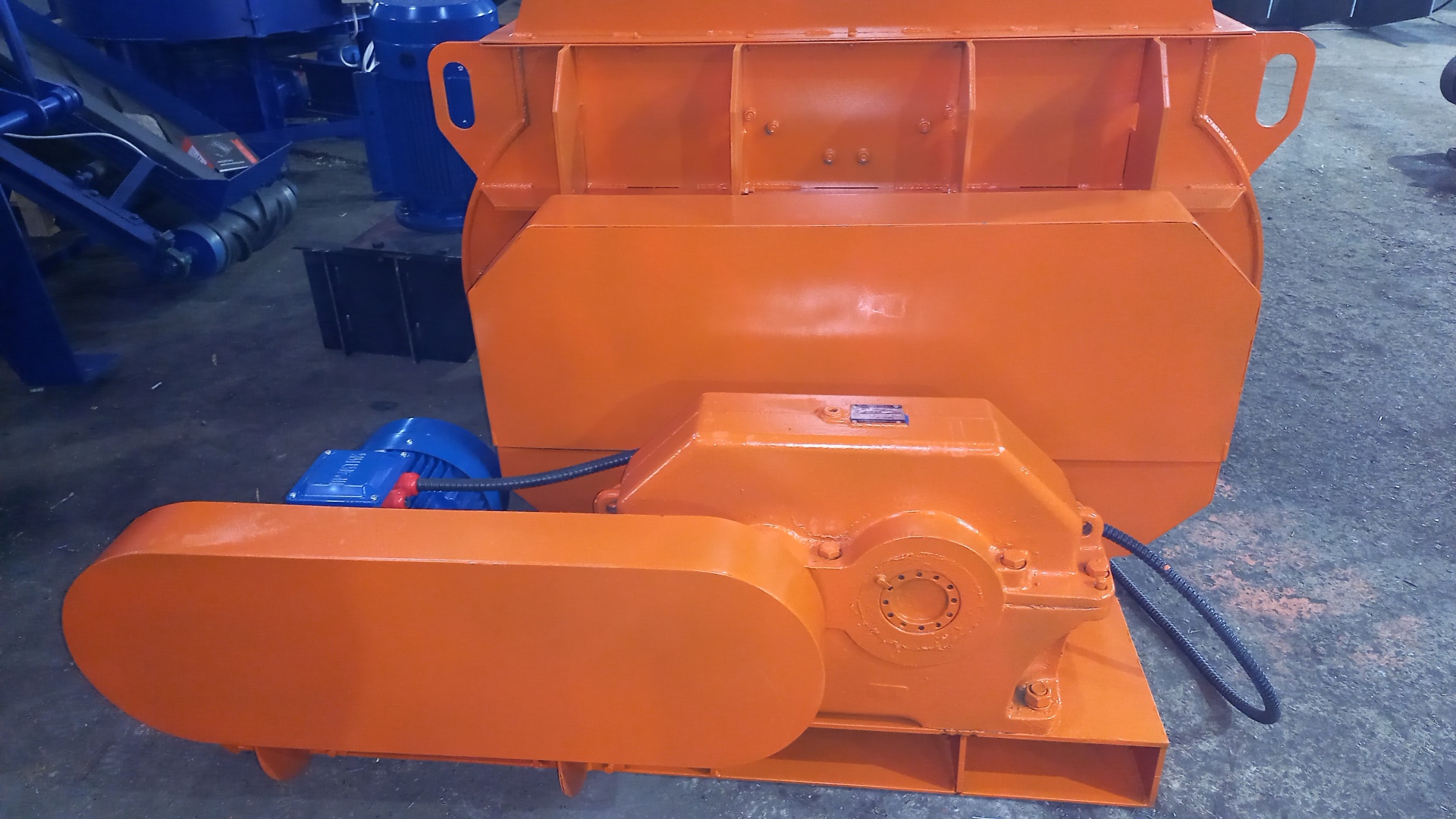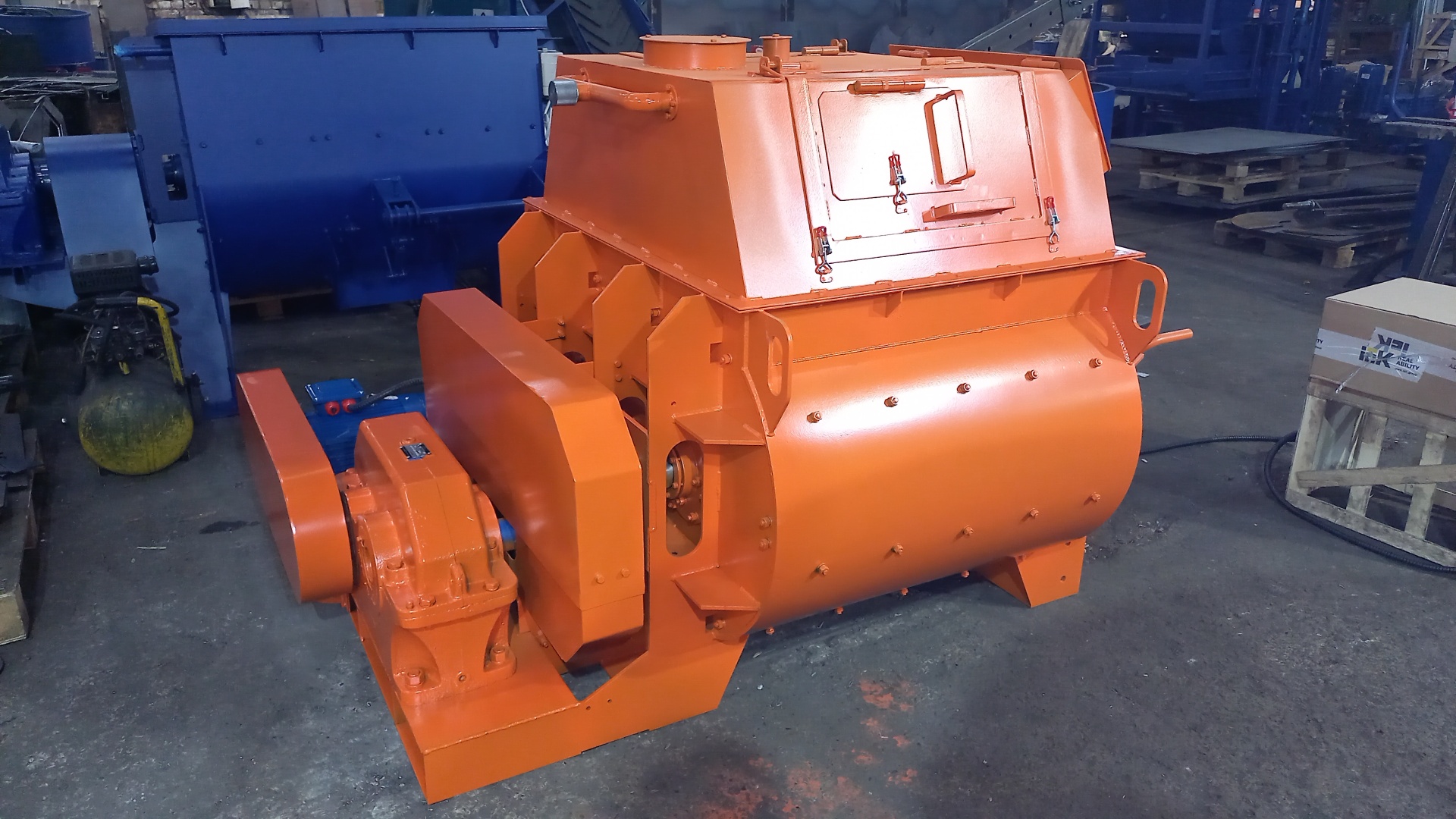 Привод осуществляется от электродвигателя через закрытую кожухом ременную передачу на редуктор, передающий крутящий момент на смесительные валы.