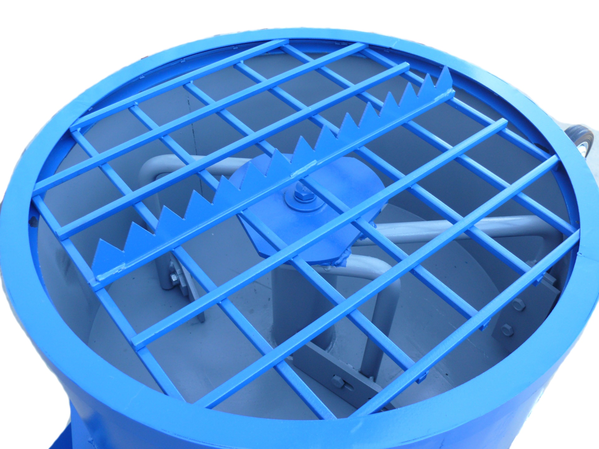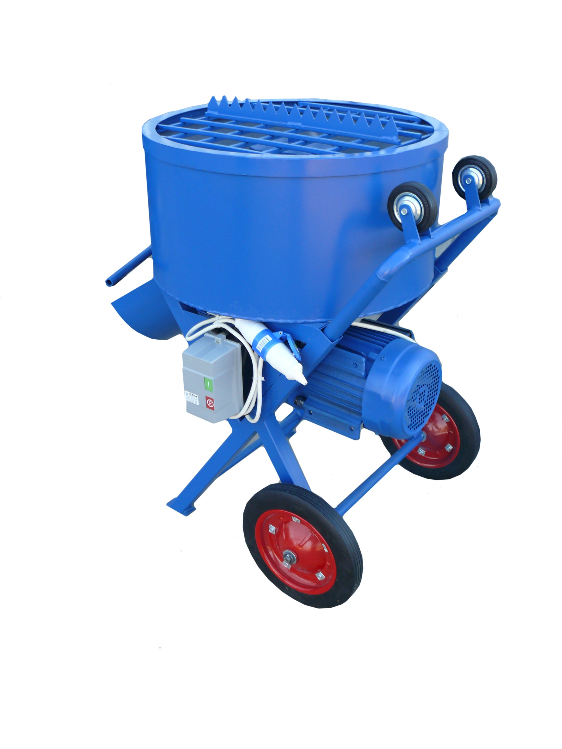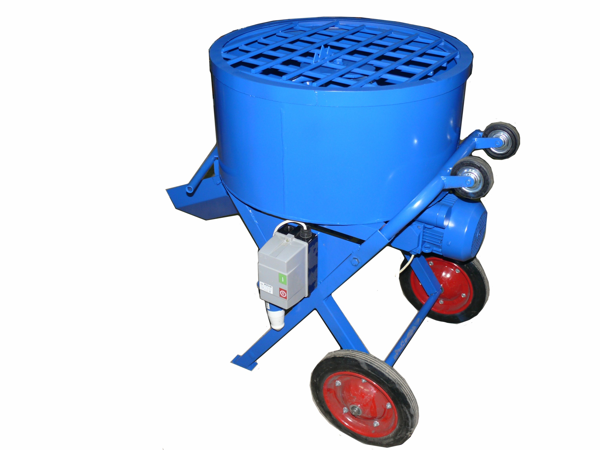 На защитной решетке имеется специальный нож, который приспособлен для разрезания мешков с готовой цементно-песчаной смесью или цементом. Донный не герметичный секторный затвор предназначен для отгрузки готовой смеси. Съемный лоток размещается непосредственно под затвором – это позволяет готовую смесь направлять в приготовленную бадью (тару, тележку, тачку) или непосредственно к месту проведения работ (заливка опалубки или форм). Бетономсеситель окрашивается только снаружи в фирменный синий цвет (возможно окрашивание внутри по согласованию с Заказчиком).