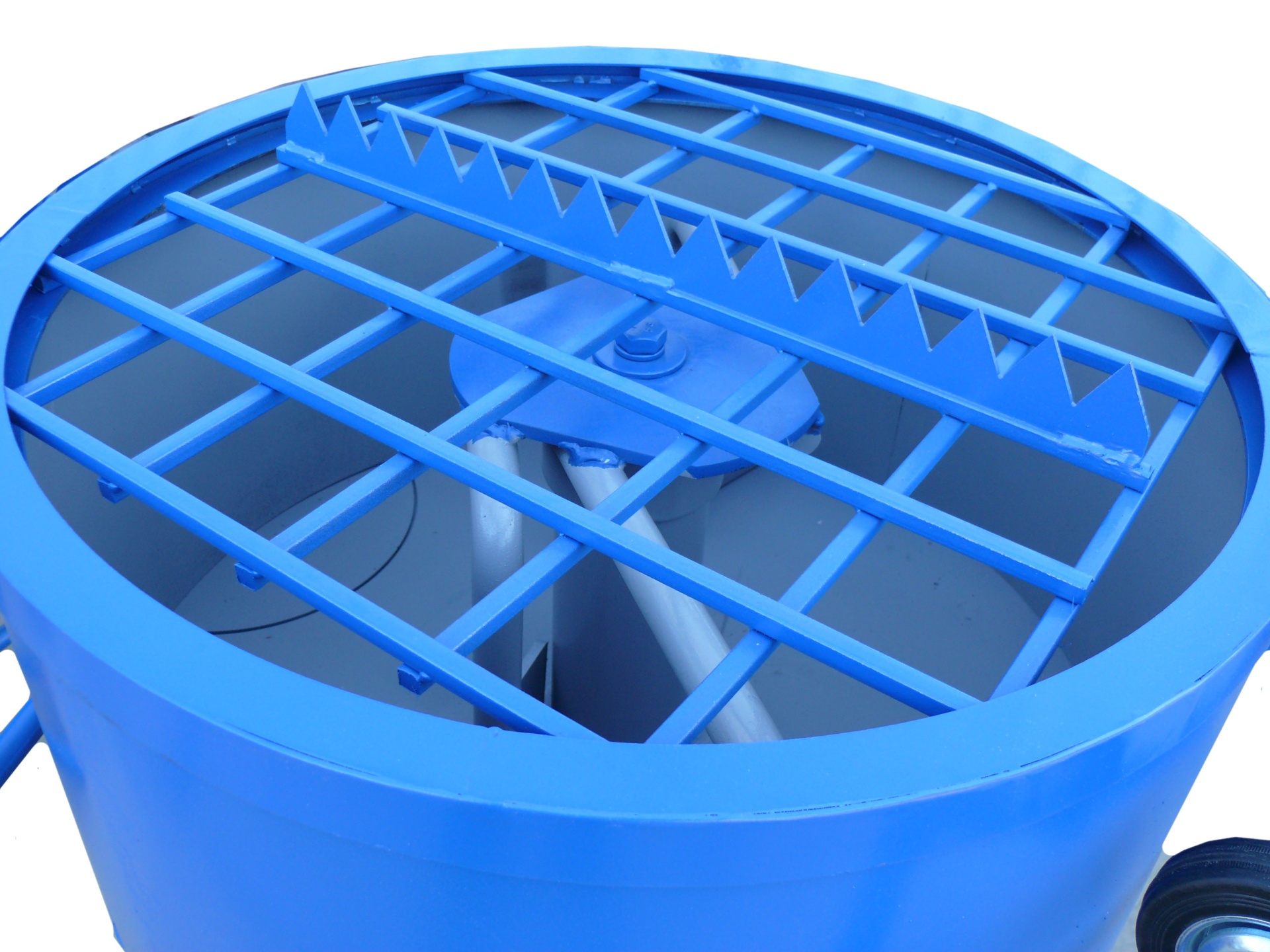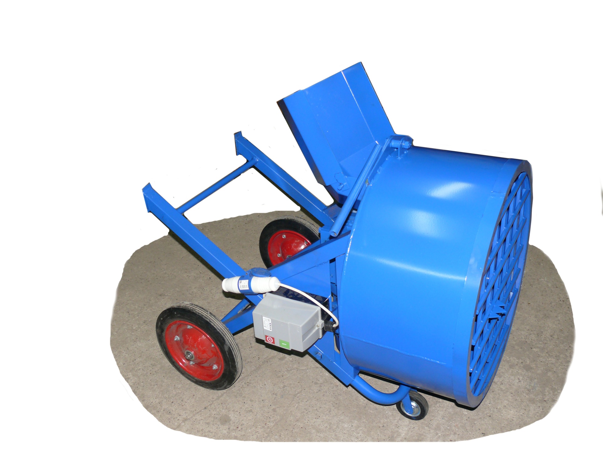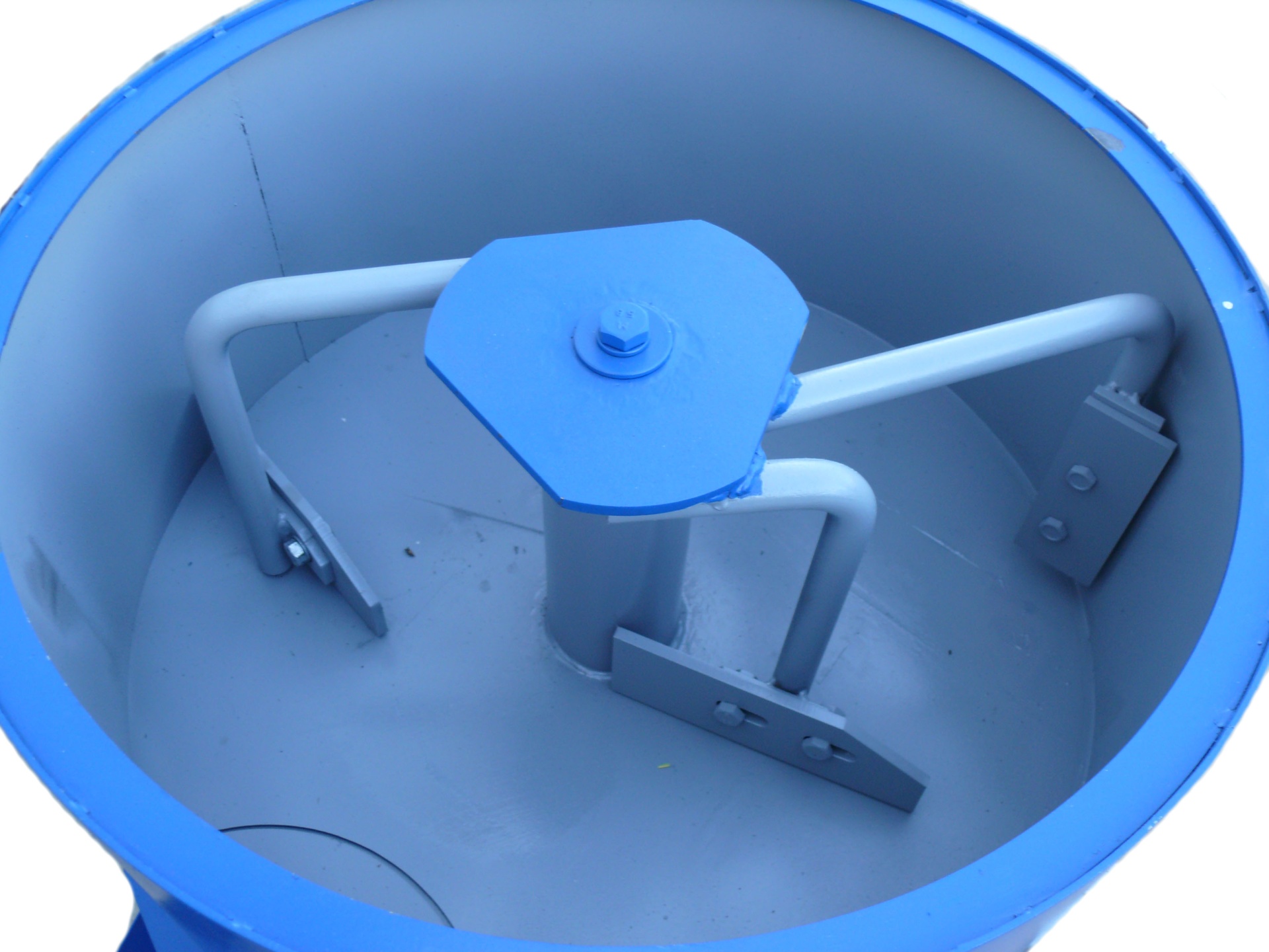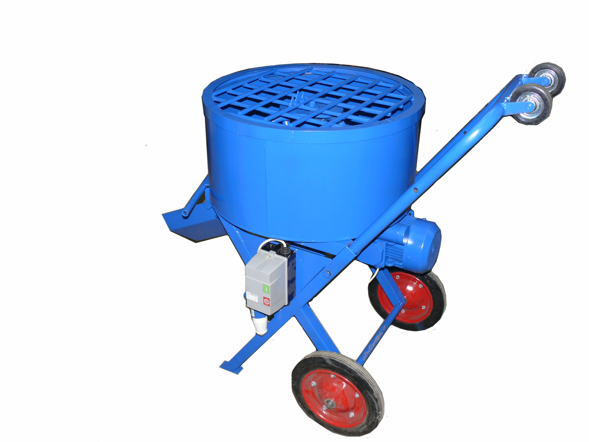 На защитной решетке имеется специальный нож, который приспособлен для разрезания мешков с готовой цементно-песчаной смесью или цементом. Донный не герметичный секторный затвор предназначен для отгрузки готовой смеси. Съемный лоток размещается непосредственно под затвором – это позволяет готовую смесь направлять в приготовленную бадью (тару, тележку, тачку) или непосредственно к месту проведения работ (заливка опалубки или форм). Бетономсеситель окрашивается только снаружи в фирменный синий цвет (возможно окрашивание внутри по согласованию с Заказчиком).