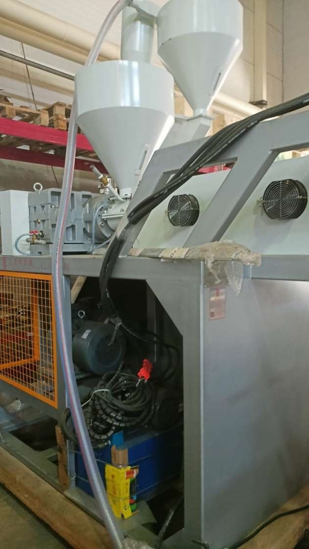 Экструдер А: Шнек выполнен из материала 38CrMoAl, диаметром в 70мм. Двигатель с мощностью в 22кВт позволяет вращать шнек со скоростью до 120 об/мин. Экструдер имеет 3 зоны нагрева мощностью 11.7 кВт. Подача сырья осуществляется автоматически.
