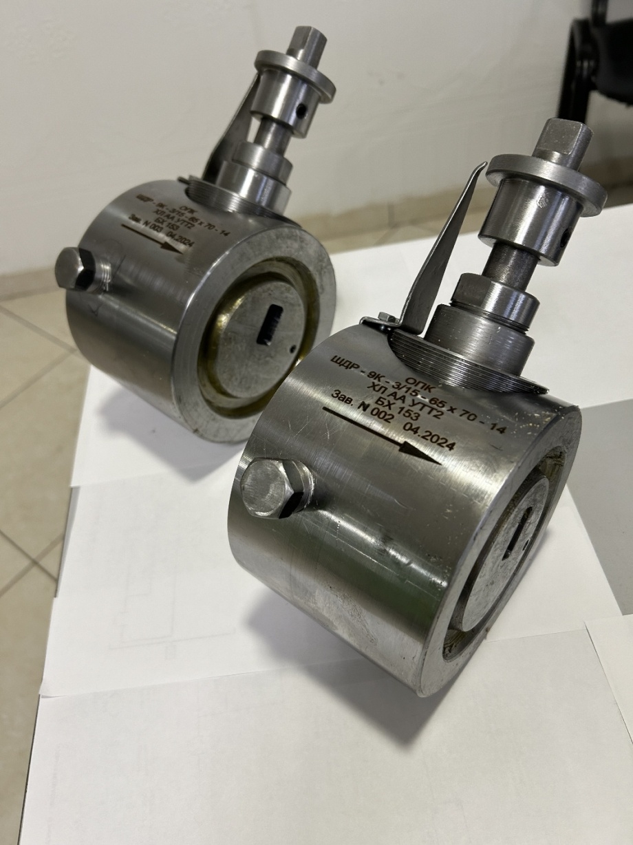 Штуцер дискретный регулируемый ШДР 9К-65х70-М коррозионно-стойкий (нержавеющая сталь) с уплотнением фланцев и корпуса буксы через стальные прокладки по ГОСТ 28919-91, а вала в корпусе буксы с помощью комплекта полиамидных шевронных уплотнений по МН 5652-78. Соединения вентилей включения манометров с зонами входа и выхода рабочей среды уплотняются в корпусе штуцера с помощью конических резьбовых отверстий. Штуцер не имеет резиновых уплотнительных элементов. Диапазон рабочего давления штуцера до 70 МПа. Рабочая среда нефть, вода, газ. Рабочая температура окружающей среды от -60°С до +40°С. Регулируемый орган золотник ф50мм. Управление штуцером ручное. Условный размер проходного отверстия регулируемого органа 2; 2, 5; 3; 4; 5; 6; 8; 10; 12; 18; 20мм. Точность калибровки отверстий 0, 3мм. Габаритные размеры, без учёта выводов для манометров, 241х140х100мм. Масса 12, 5кг. Тип кольцевой прокладки БХ 153 ГОСТ 28919-91. Корпус - сталь 12Х18Н10Т. Золотник (цилиндр) - сталь 40Х13.
