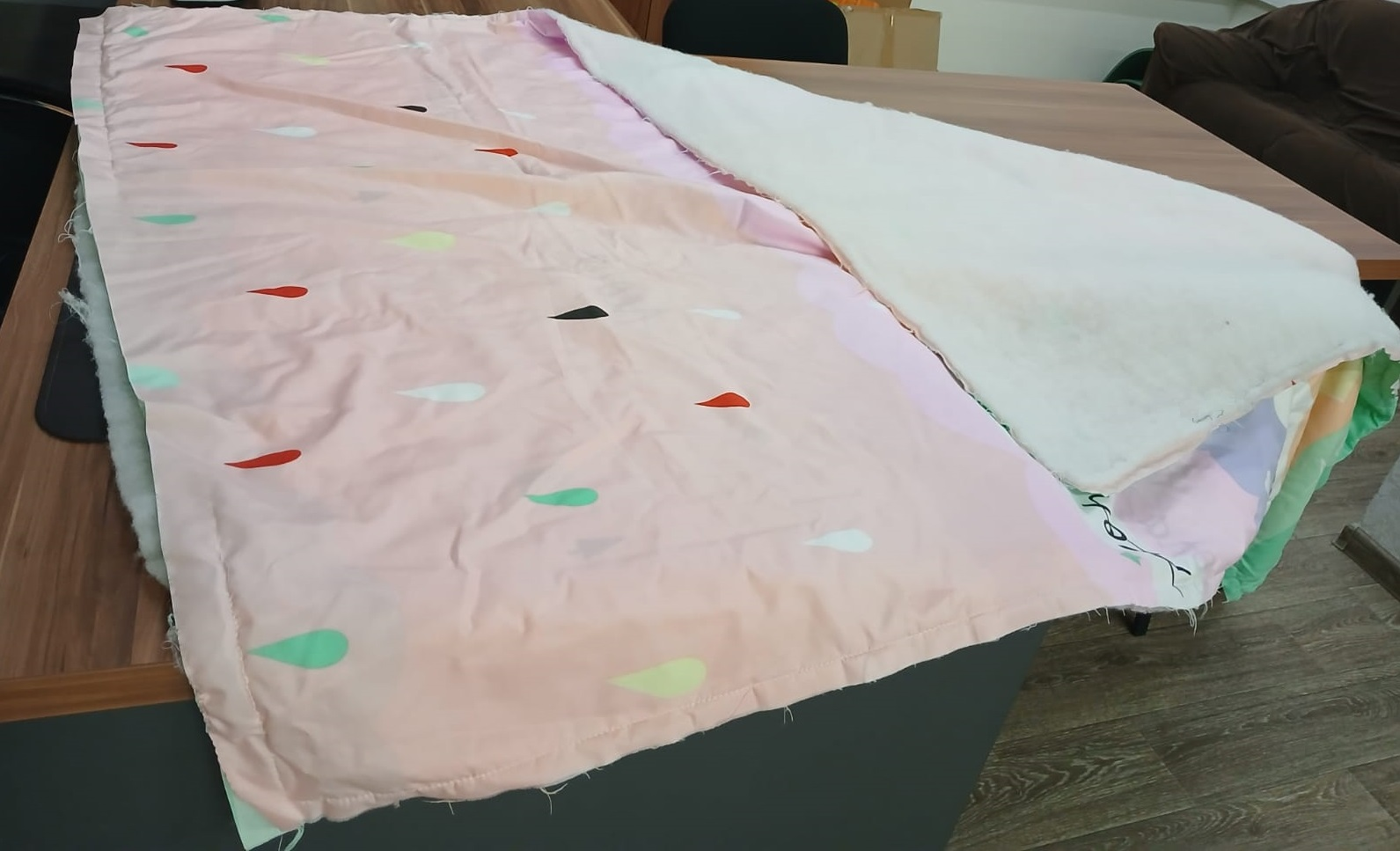 1. Два слоя ткани внизу, один слой наполнителя сверху, шитье по всему периметру с отверстия с одной стороны, нарезка по размеру. Вывернуть изделие на лицо и получить одеяло.