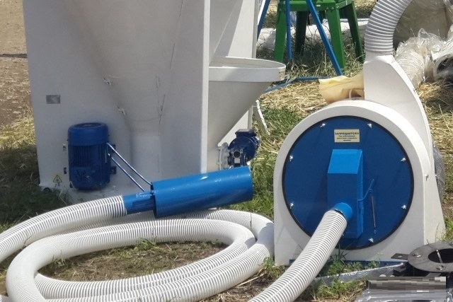 Заборный шланг с заборным устройством (эжектором) на конце вставляется в бурт измельчаемого сырья. Дробилка сама воздухом засасывает продукт по принципу пылесоса, дробит и измельченный материал выбрасывает по выгрузному шлангу в смеситель, бункер и т.д. Фракция измельчения регулируется сменными ситами (жалюзями на дековой дробилке)